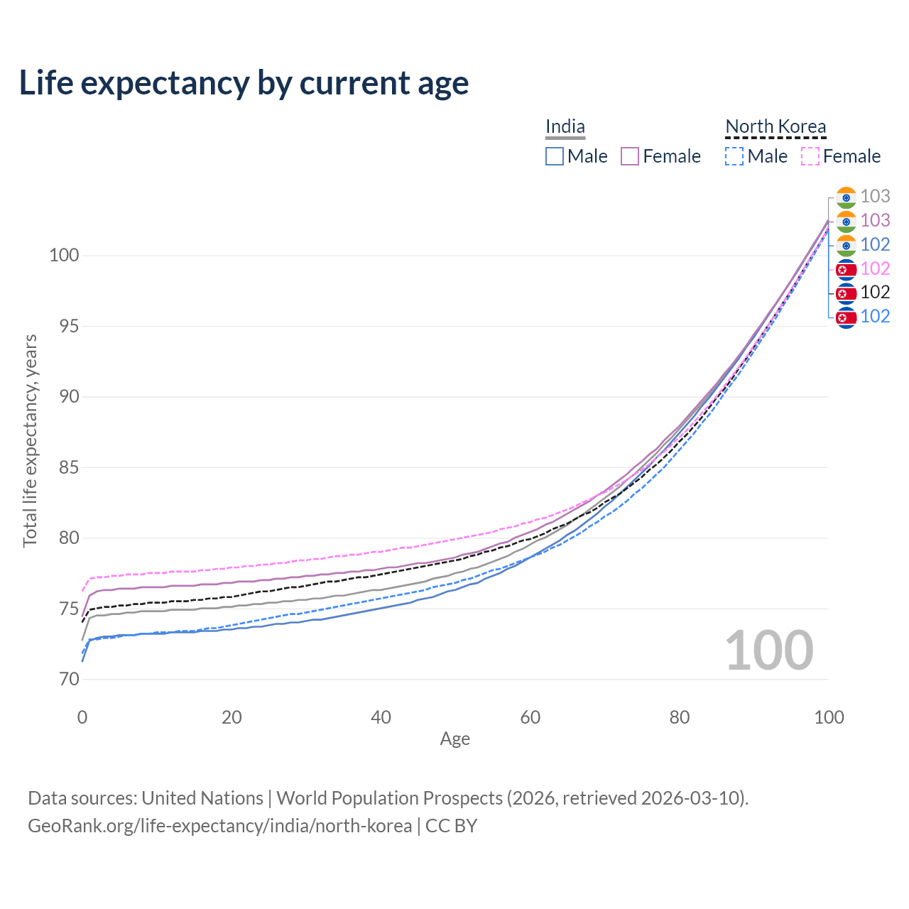 This life expectancy calculator shows the odds of living to 100, 95, 90, and below based on current age for both males and females in India and North Korea, along with mean and median age of death. The calculations are based on the 2026 life tables (actuarial tables) from the UN World Population Prospects.