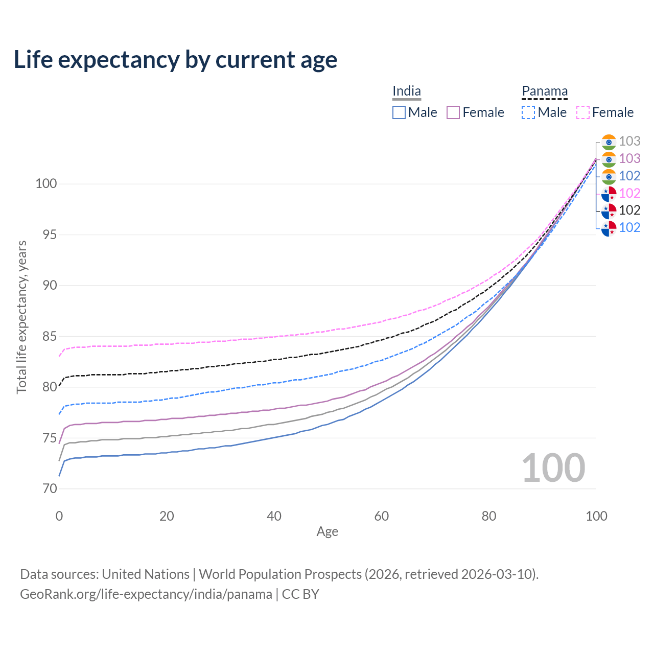 This life expectancy calculator shows the odds of living to 100, 95, 90, and below based on current age for both males and females in India and Panama, along with mean and median age of death. The calculations are based on the 2026 life tables (actuarial tables) from the UN World Population Prospects.
