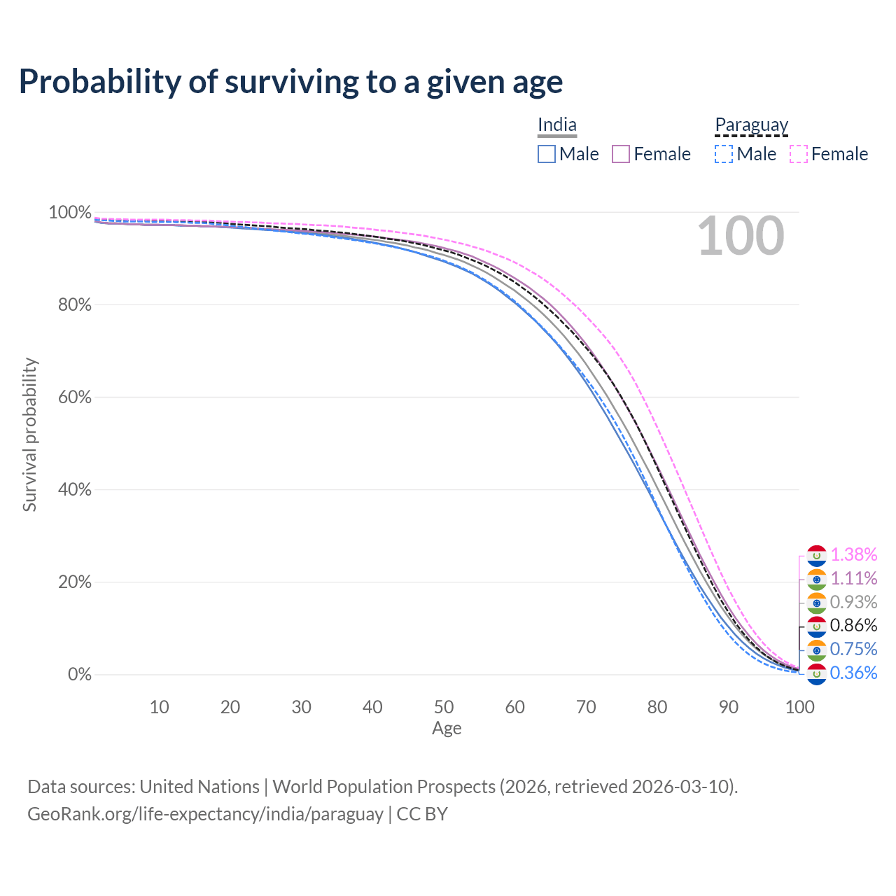 This life expectancy calculator shows the odds of living to 100, 95, 90, and below based on current age for both males and females in India and Paraguay, along with mean and median age of death. The calculations are based on the 2026 life tables (actuarial tables) from the UN World Population Prospects.