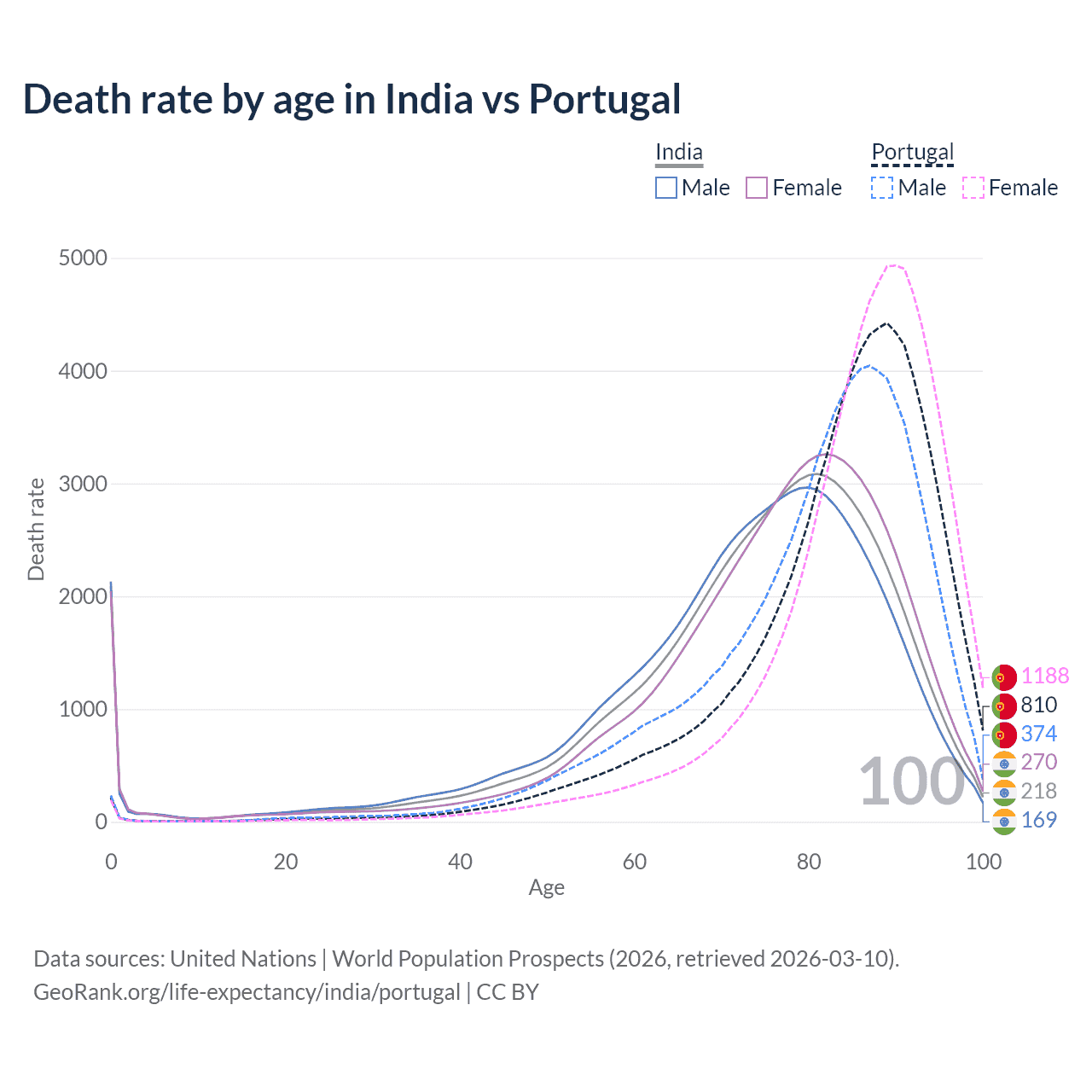 In India, the most common age of death is 81, compared to 89 in Portugal. The median age of death is 76.8 in India and 85.9 in Portugal, meaning only half of each cohort is expected to live past that age.