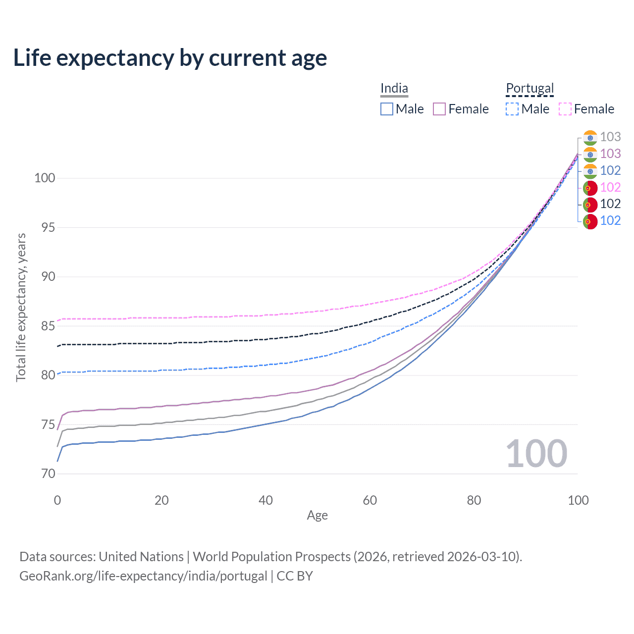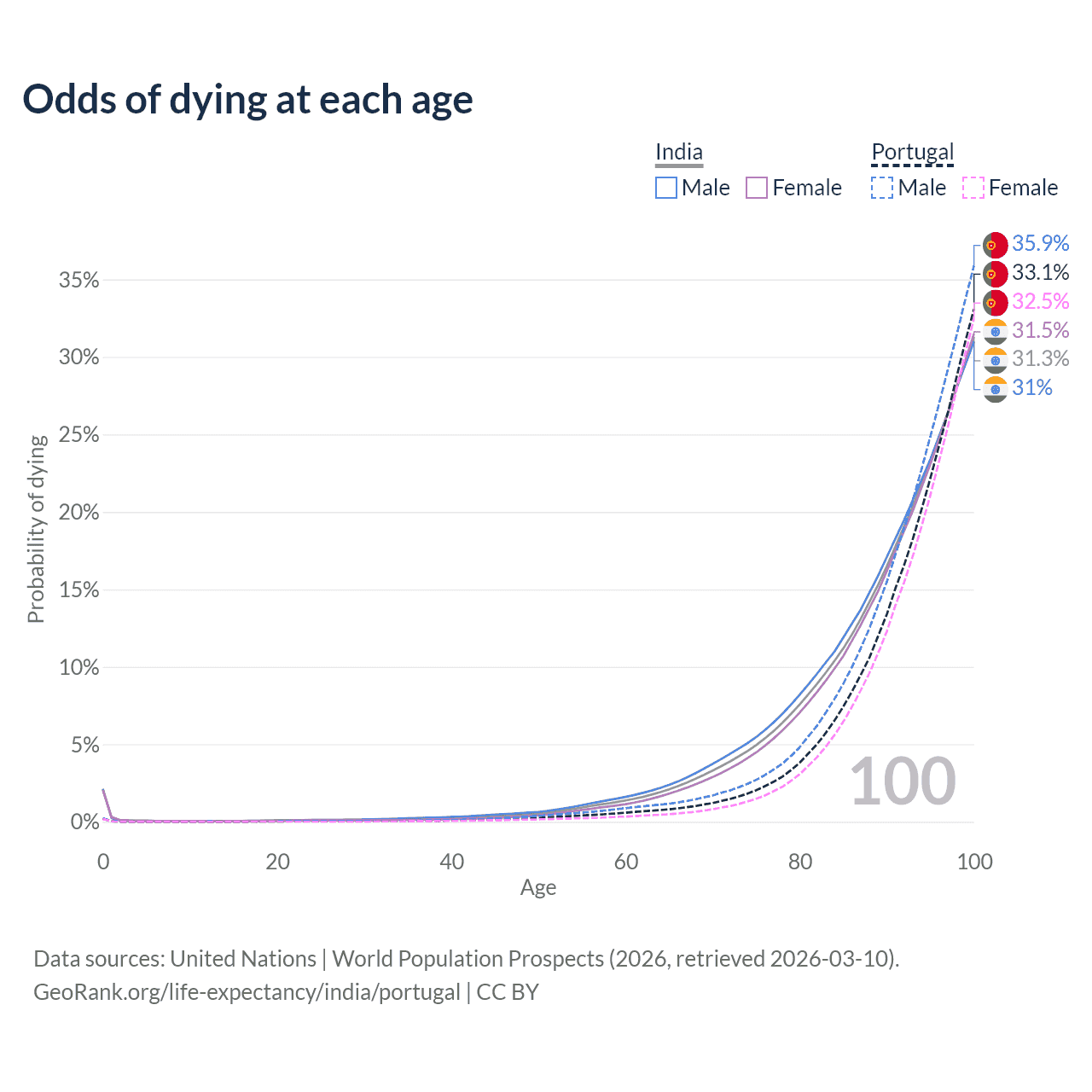 This life expectancy calculator shows the odds of living to 100, 95, 90, and below based on current age for both males and females in India and Portugal, along with mean and median age of death. The calculations are based on the 2026 life tables (actuarial tables) from the UN World Population Prospects.