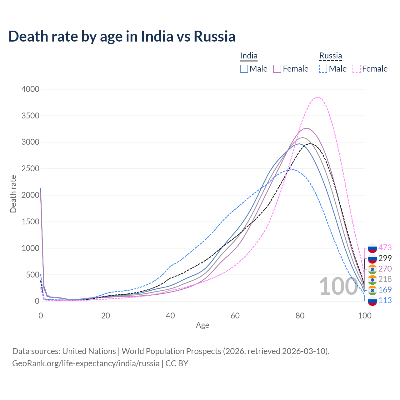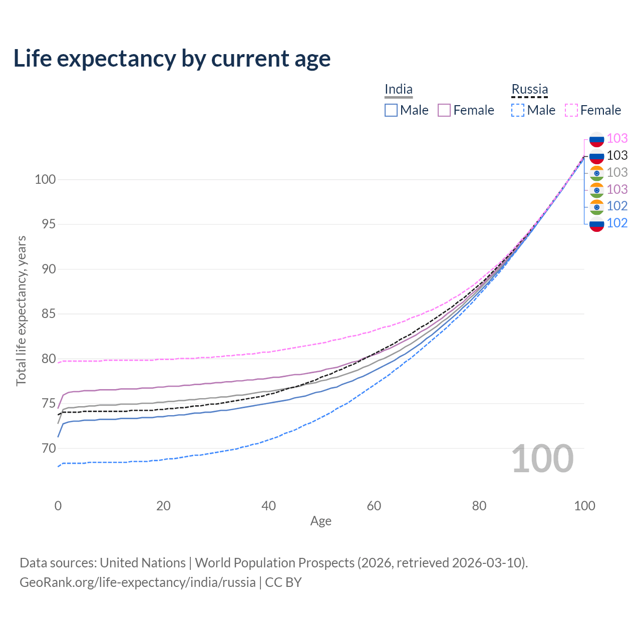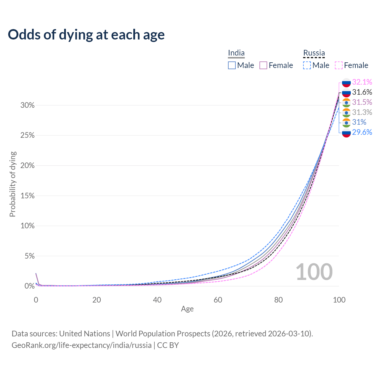 This life expectancy calculator shows the odds of living to 100, 95, 90, and below based on current age for both males and females in India and Russia, along with mean and median age of death. The calculations are based on the 2026 life tables (actuarial tables) from the UN World Population Prospects.