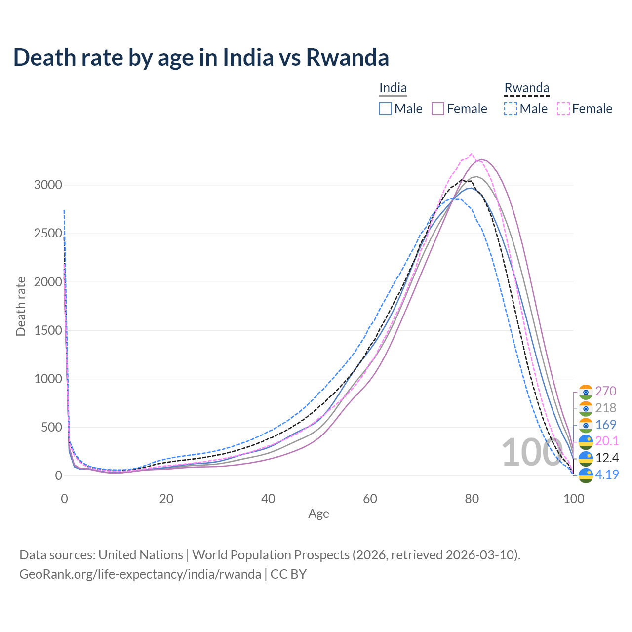 In India, the most common age of death is 81, compared to 78 in Rwanda. The median age of death is 76.8 in India and 73.5 in Rwanda, meaning only half of each cohort is expected to live past that age.