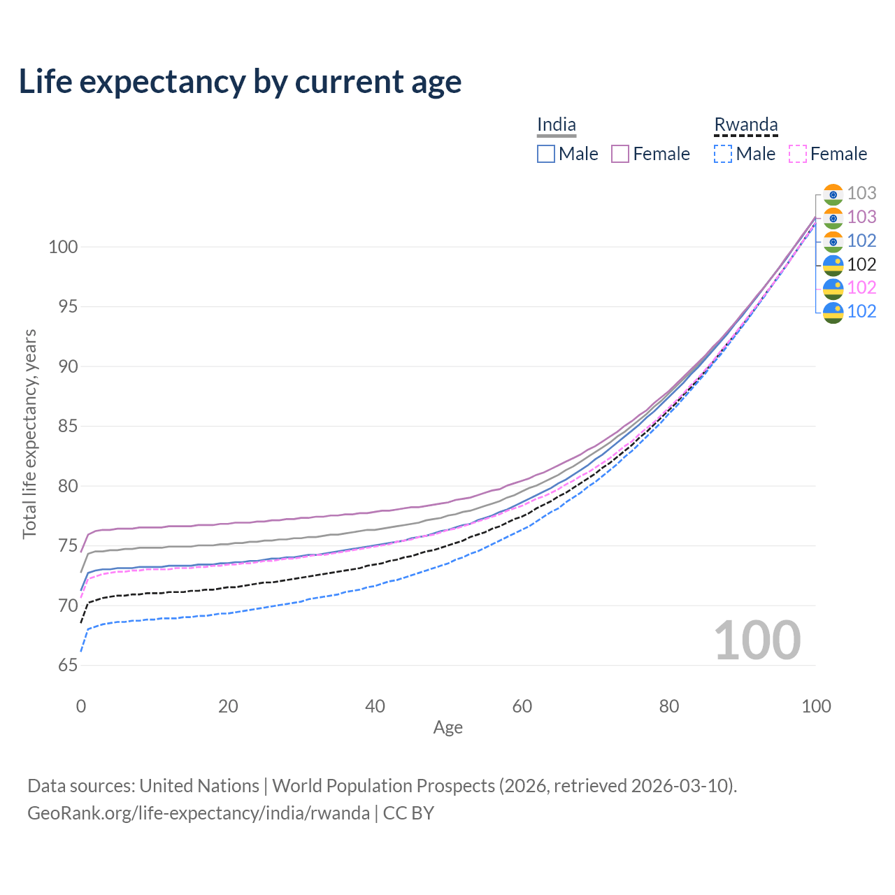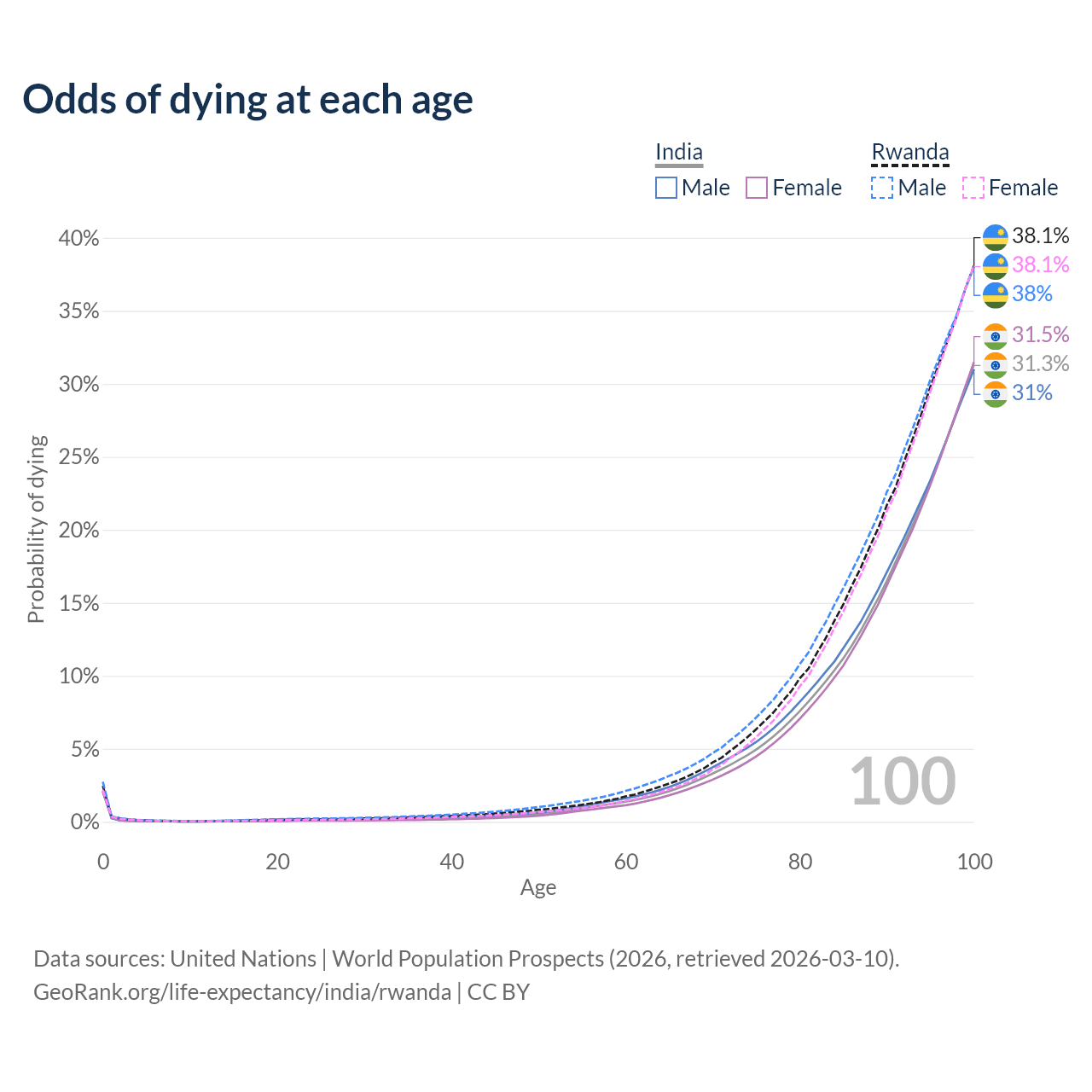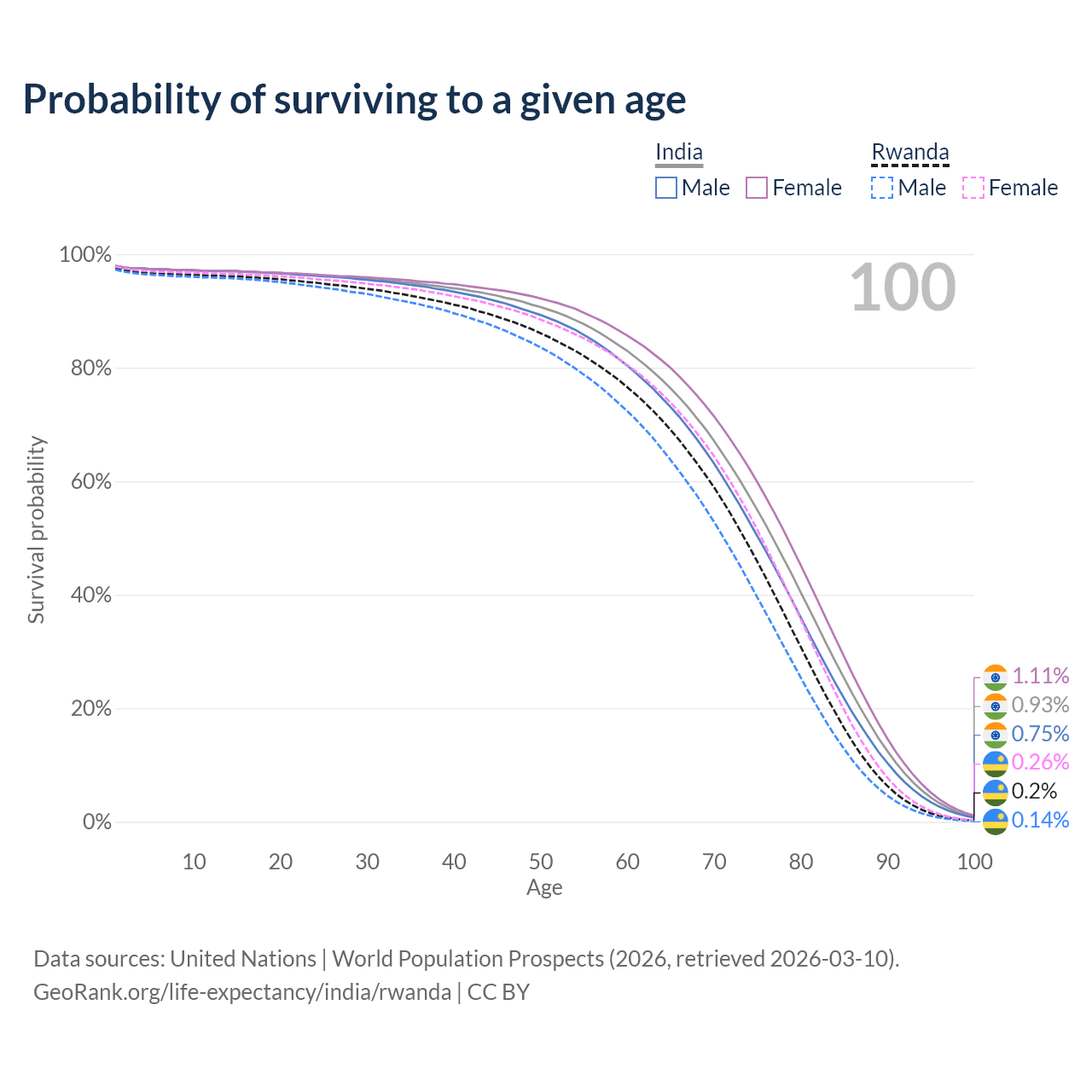 This life expectancy calculator shows the odds of living to 100, 95, 90, and below based on current age for both males and females in India and Rwanda, along with mean and median age of death. The calculations are based on the 2026 life tables (actuarial tables) from the UN World Population Prospects.