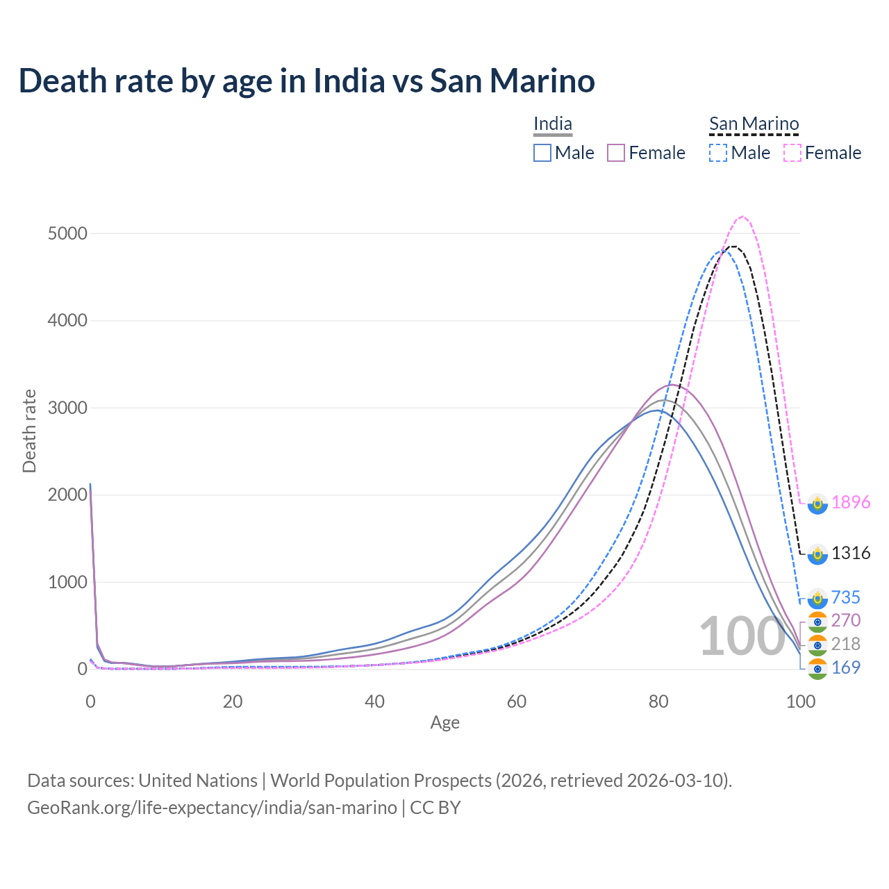 In India, the most common age of death is 81, compared to 91 in San Marino. The median age of death is 76.8 in India and 88.3 in San Marino, meaning only half of each cohort is expected to live past that age.