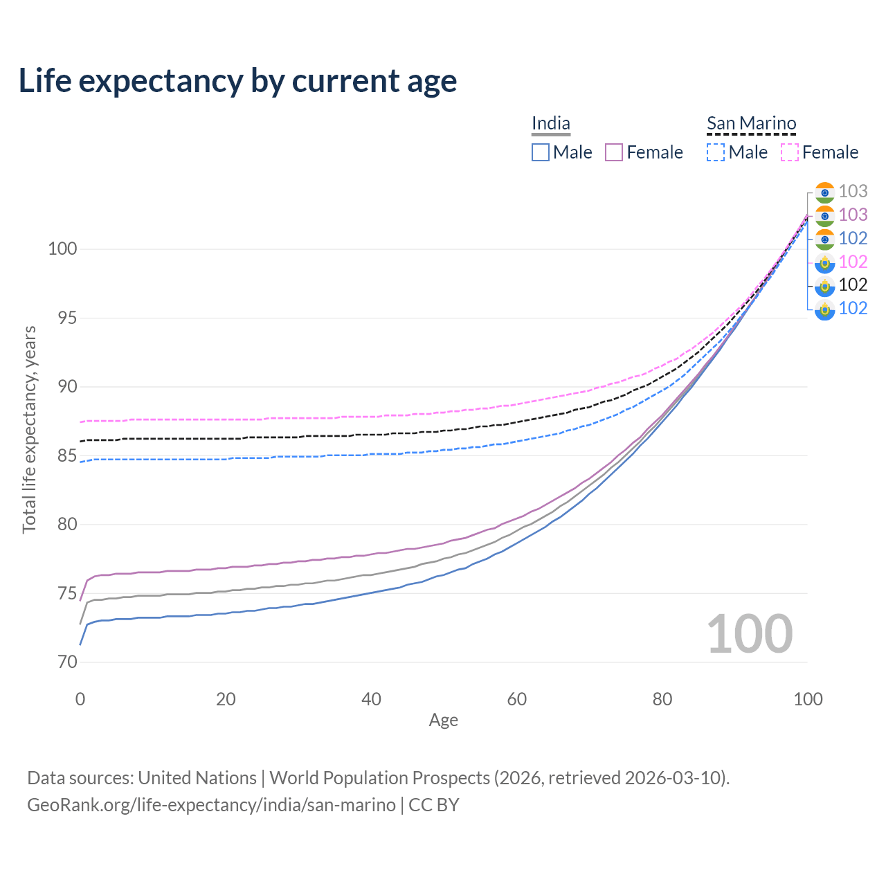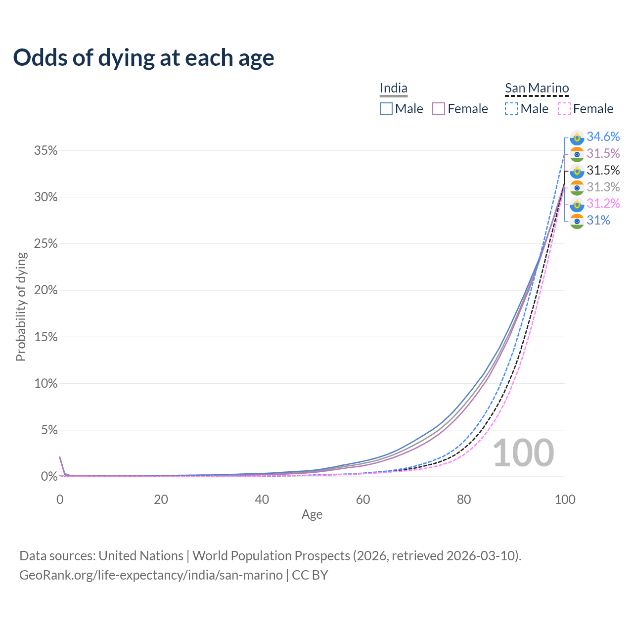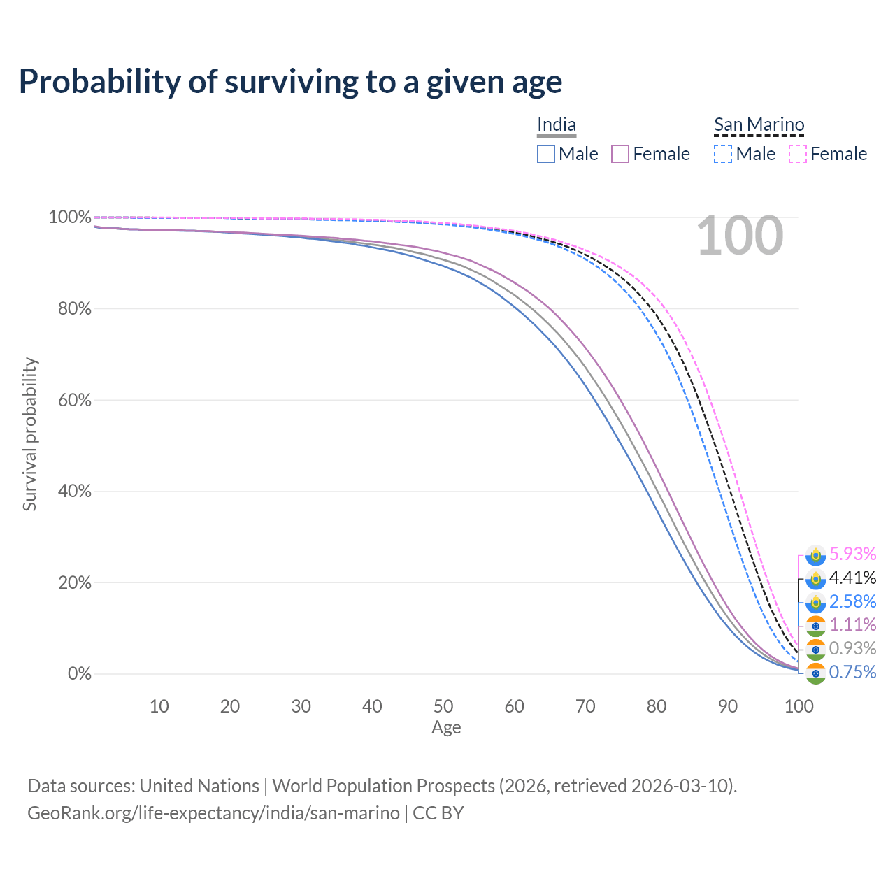 This life expectancy calculator shows the odds of living to 100, 95, 90, and below based on current age for both males and females in India and San Marino, along with mean and median age of death. The calculations are based on the 2026 life tables (actuarial tables) from the UN World Population Prospects.