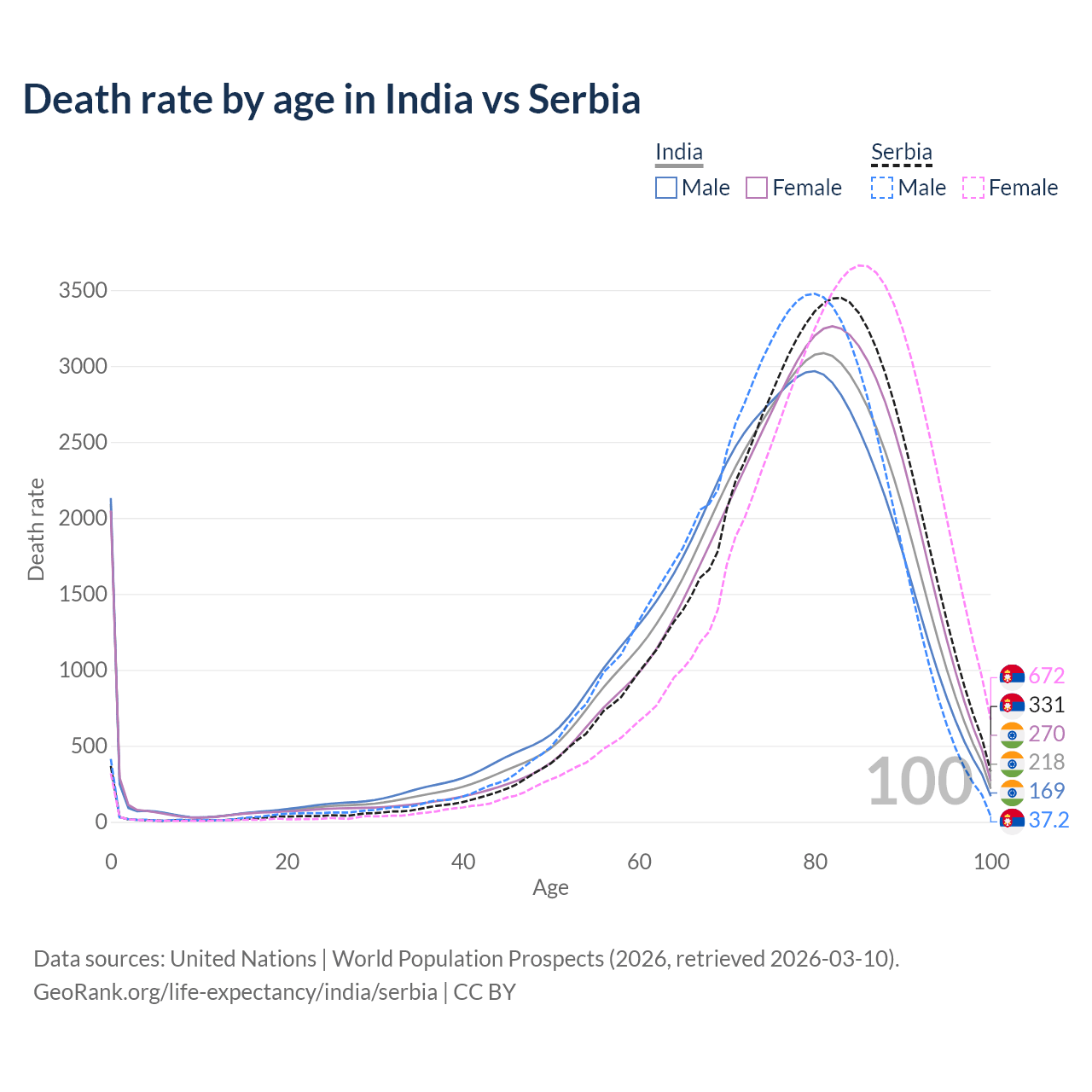 This life expectancy calculator shows the odds of living to 100, 95, 90, and below based on current age for both males and females in India and Serbia, along with mean and median age of death. The calculations are based on the 2026 life tables (actuarial tables) from the UN World Population Prospects.