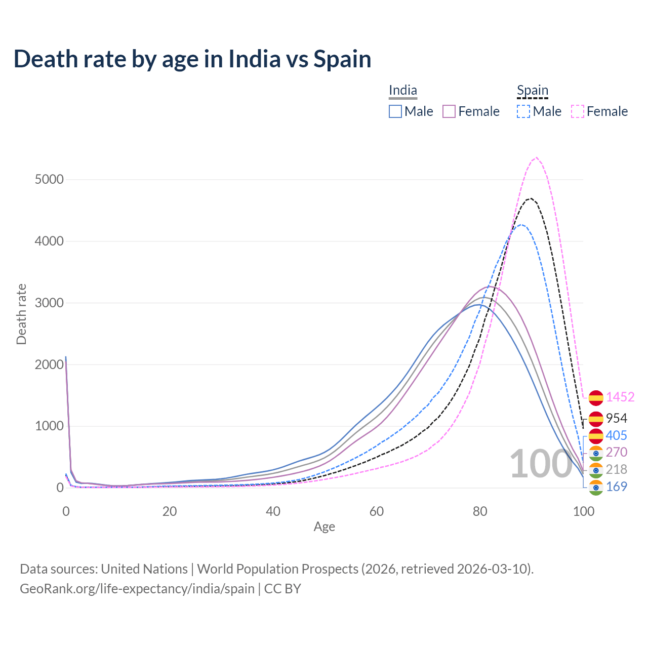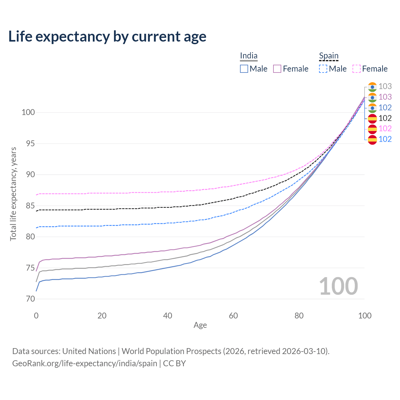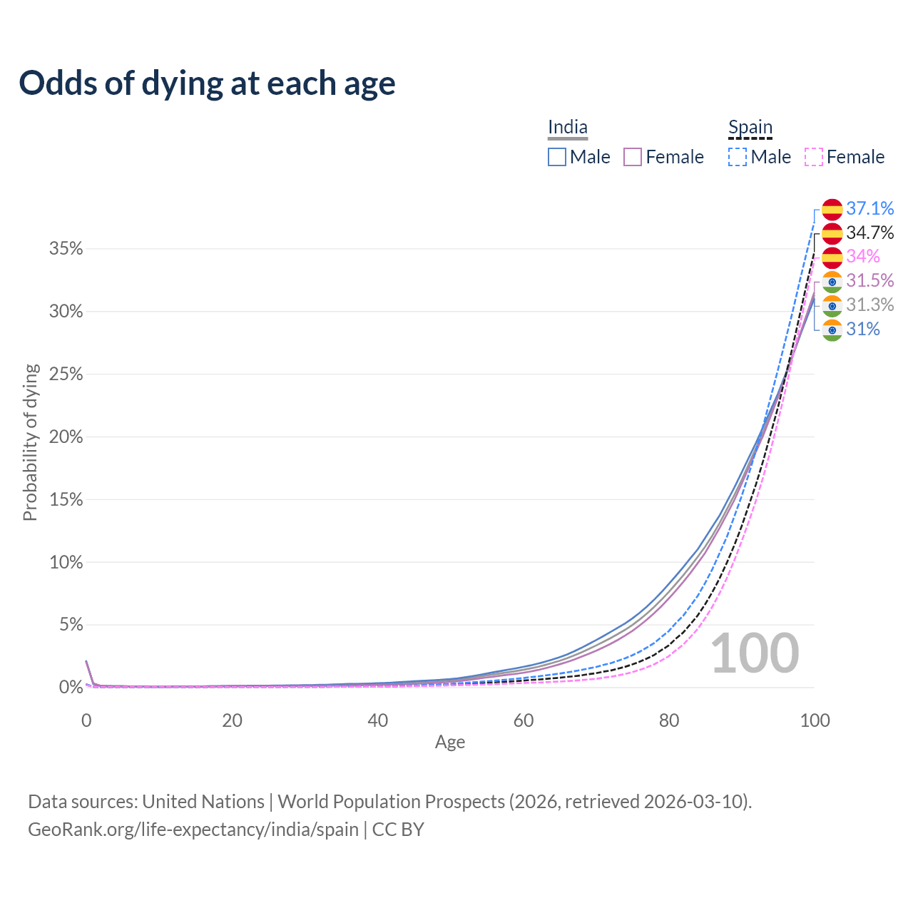 This life expectancy calculator shows the odds of living to 100, 95, 90, and below based on current age for both males and females in India and Spain, along with mean and median age of death. The calculations are based on the 2026 life tables (actuarial tables) from the UN World Population Prospects.