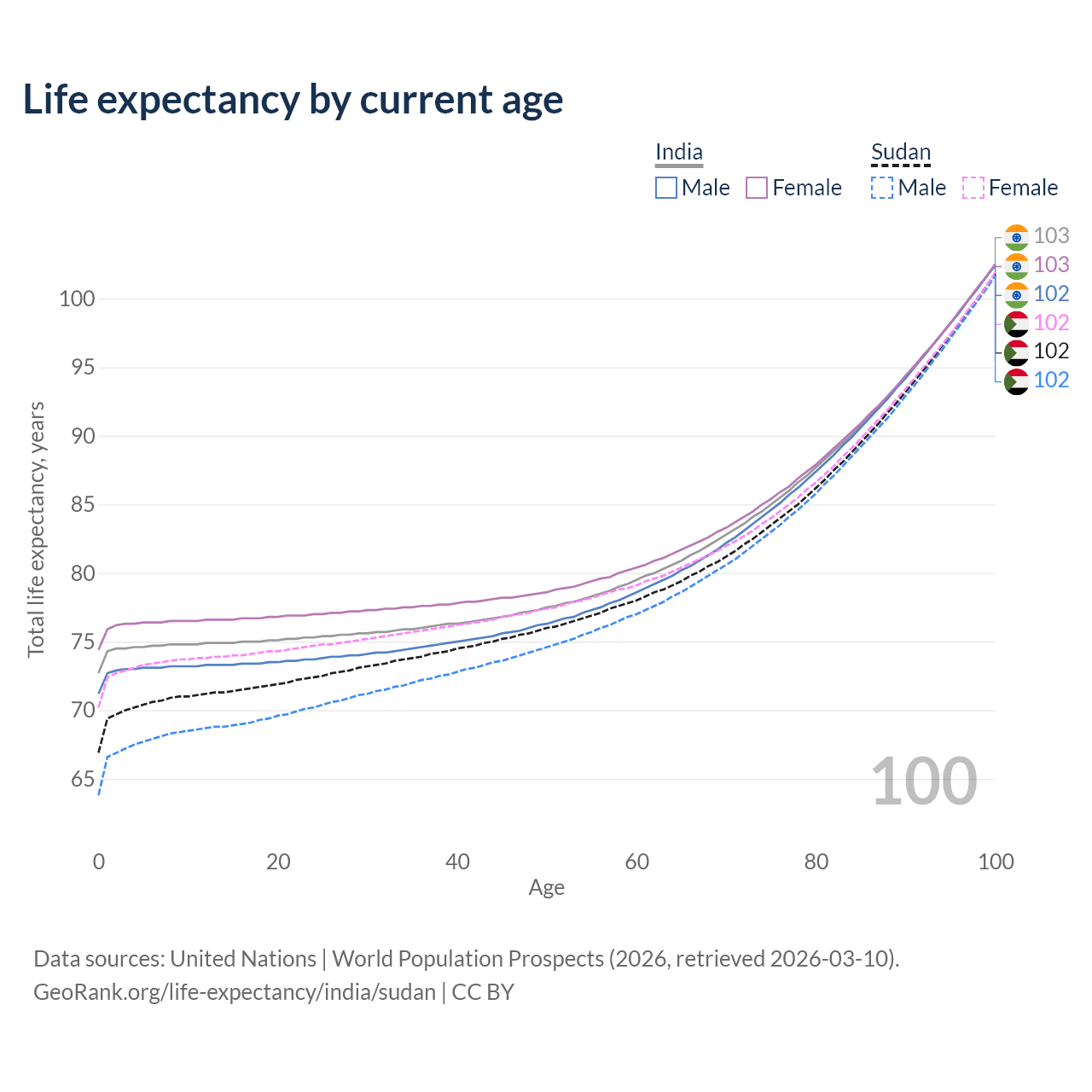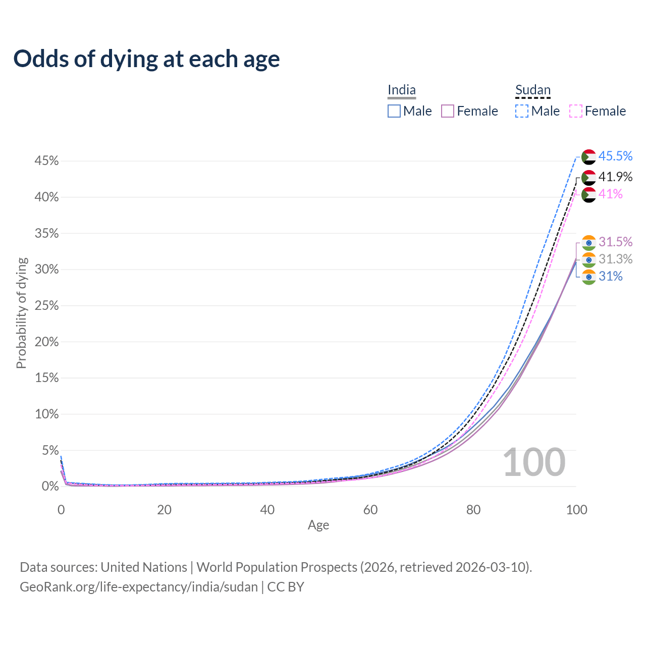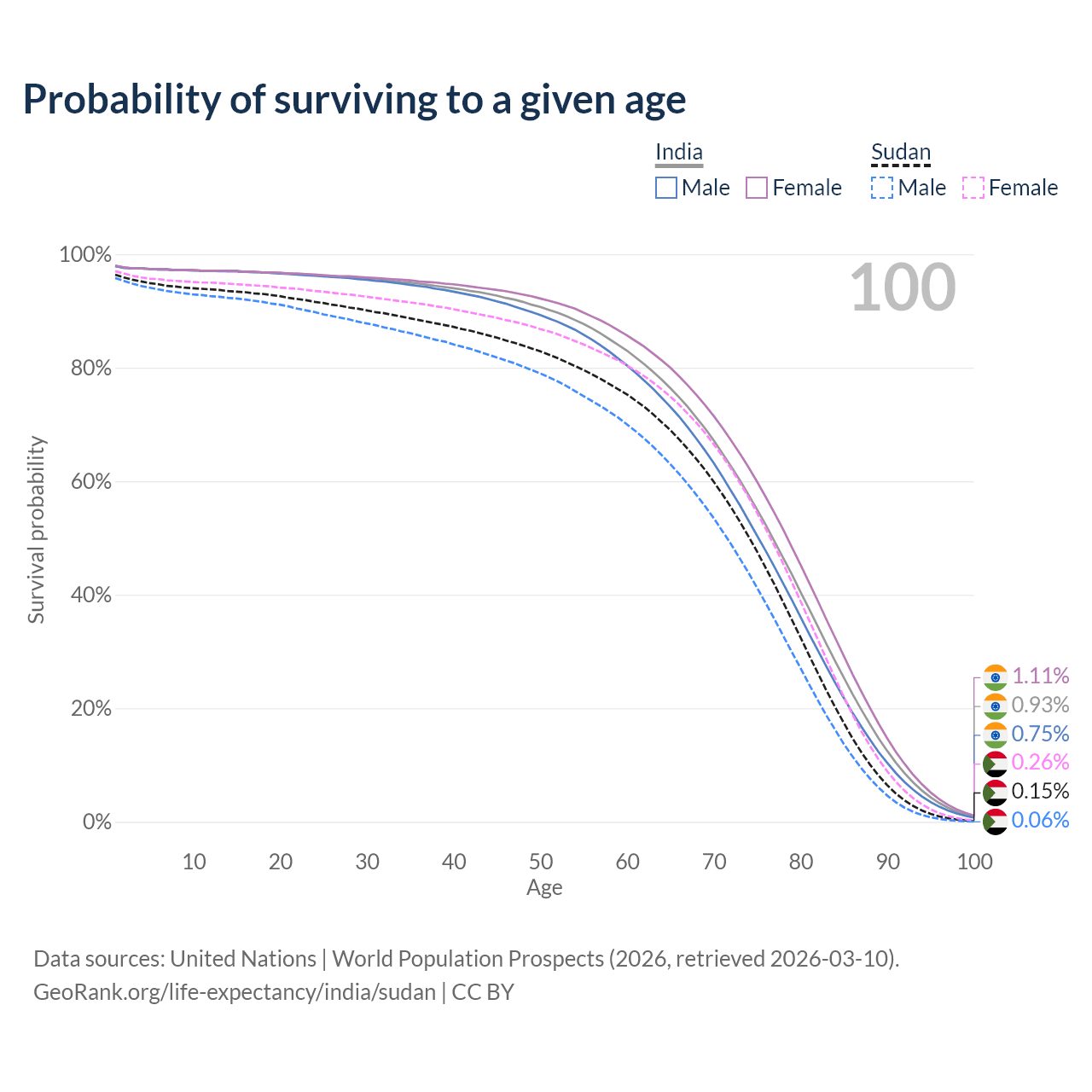 This life expectancy calculator shows the odds of living to 100, 95, 90, and below based on current age for both males and females in India and Sudan, along with mean and median age of death. The calculations are based on the 2026 life tables (actuarial tables) from the UN World Population Prospects.