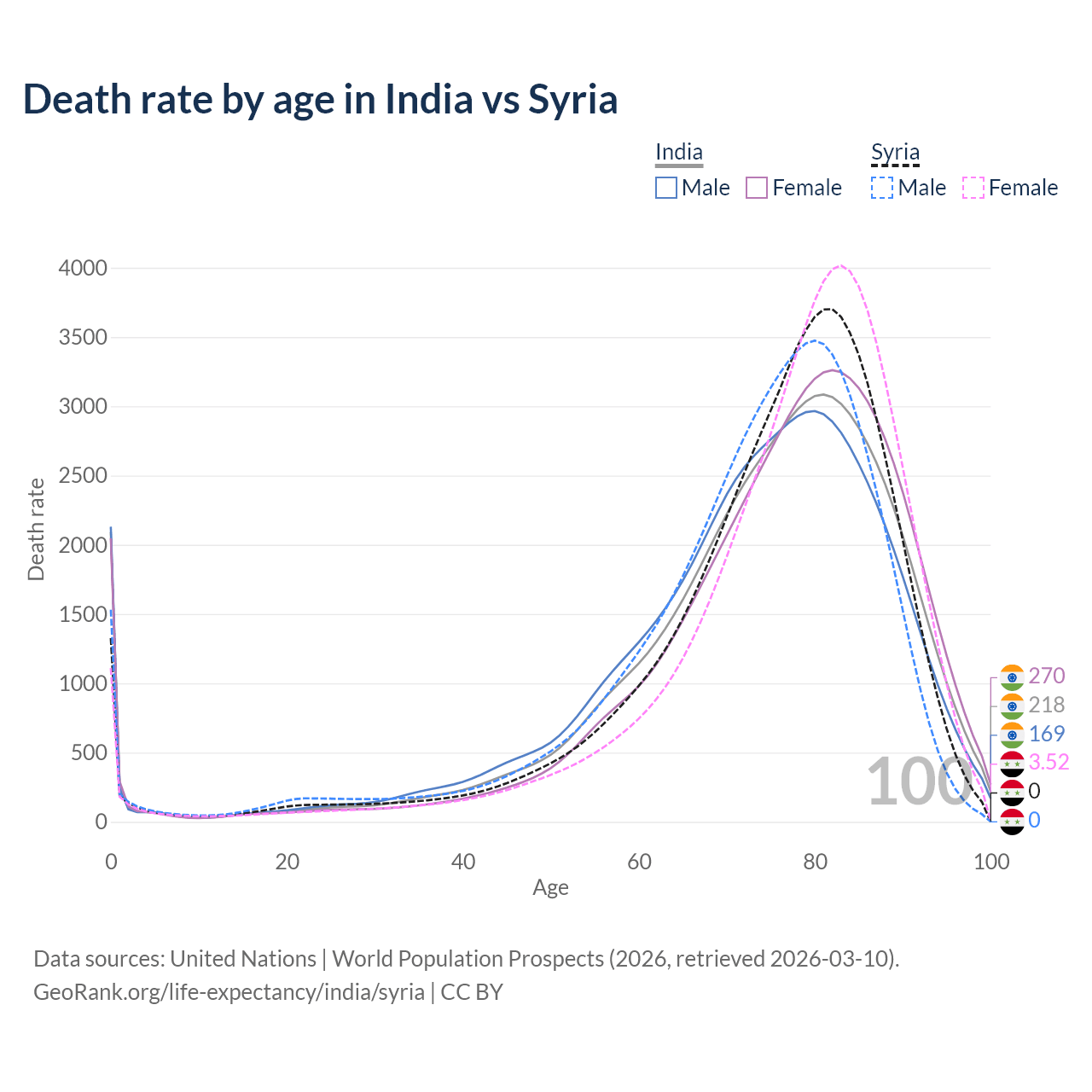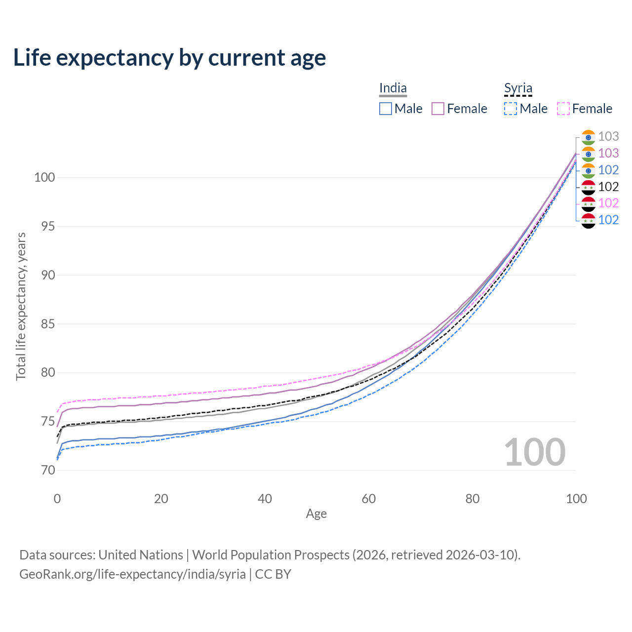 This life expectancy calculator shows the odds of living to 100, 95, 90, and below based on current age for both males and females in India and Syria, along with mean and median age of death. The calculations are based on the 2026 life tables (actuarial tables) from the UN World Population Prospects.