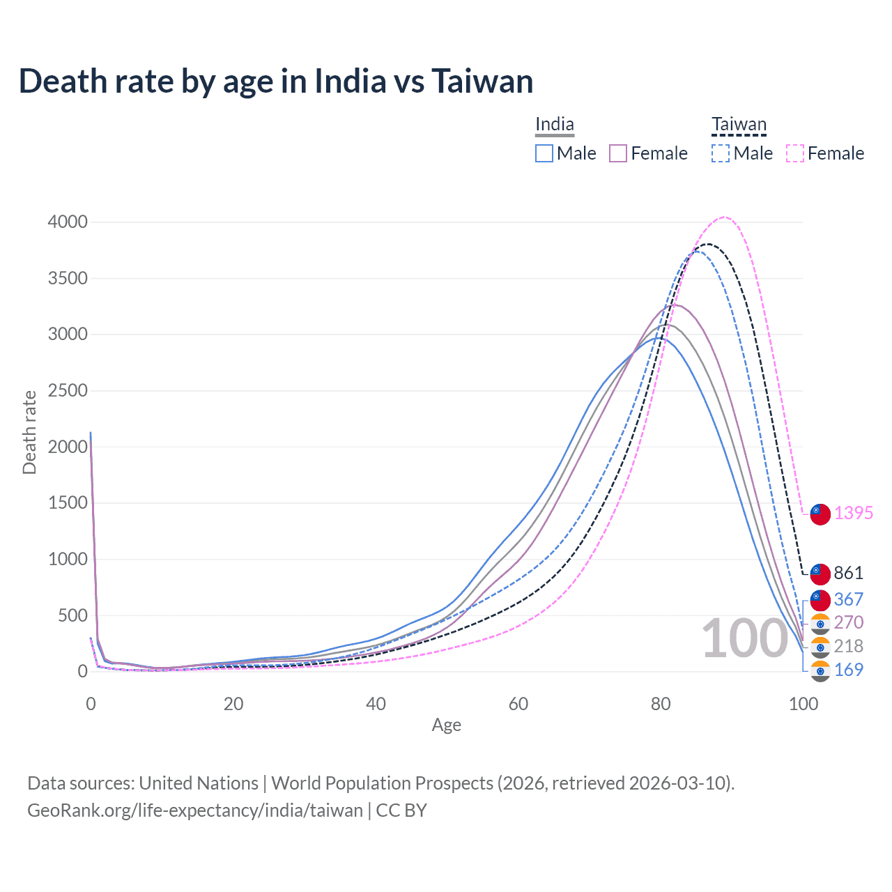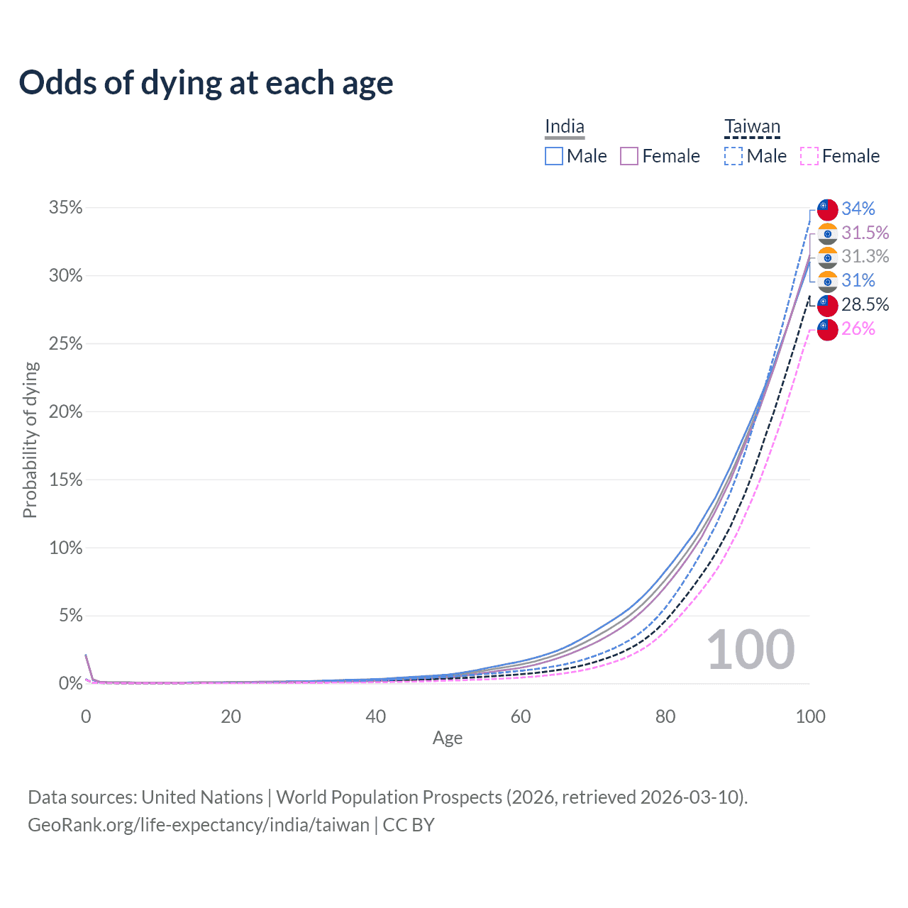 This life expectancy calculator shows the odds of living to 100, 95, 90, and below based on current age for both males and females in India and Taiwan, along with mean and median age of death. The calculations are based on the 2026 life tables (actuarial tables) from the UN World Population Prospects.