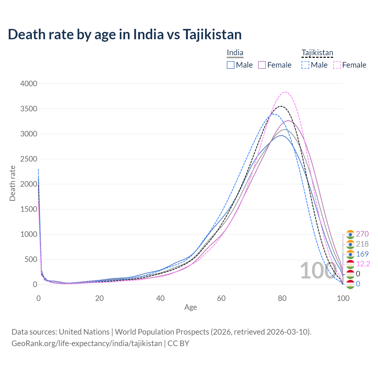 In India, the most common age of death is 81, compared to 80 in Tajikistan. The median age of death is 76.8 in India and 76 in Tajikistan, meaning only half of each cohort is expected to live past that age.