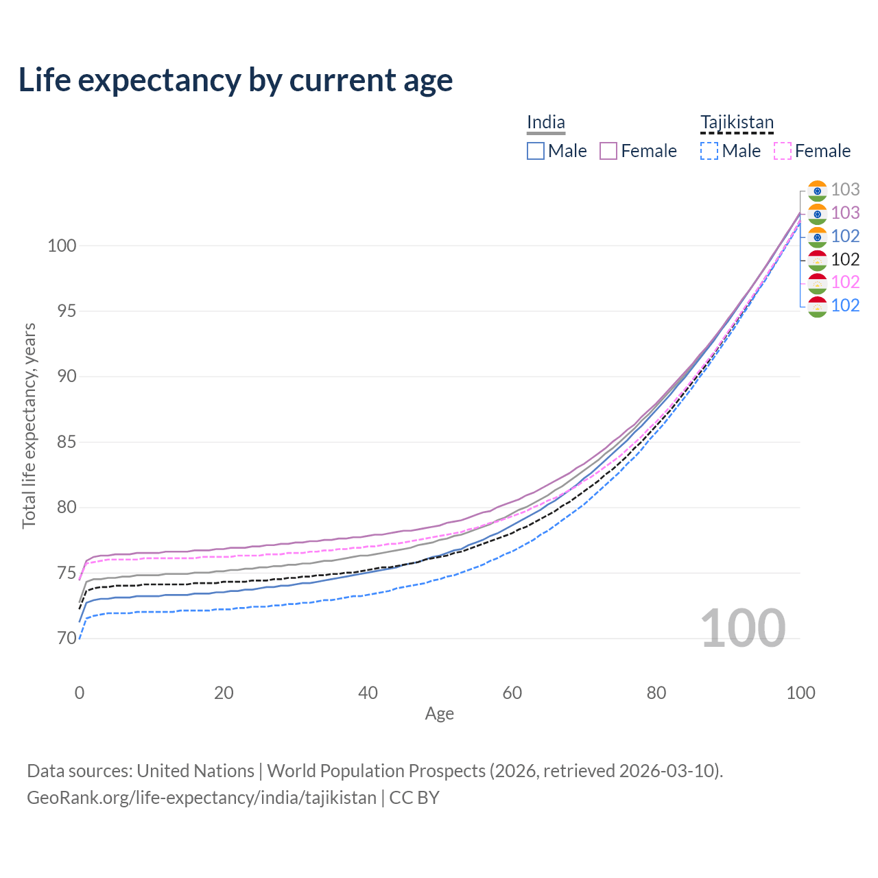 This life expectancy calculator shows the odds of living to 100, 95, 90, and below based on current age for both males and females in India and Tajikistan, along with mean and median age of death. The calculations are based on the 2026 life tables (actuarial tables) from the UN World Population Prospects.
