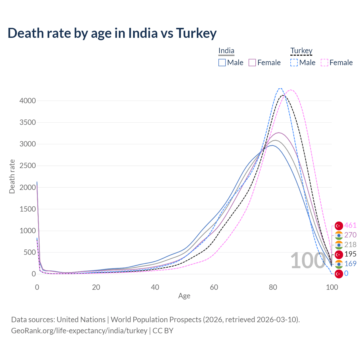 In India, the most common age of death is 81, compared to 83 in Turkey. The median age of death is 76.8 in India and 81.4 in Turkey, meaning only half of each cohort is expected to live past that age.