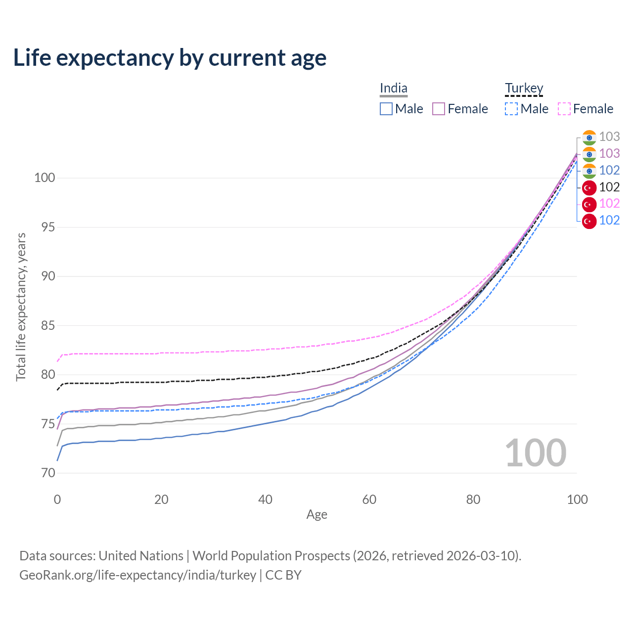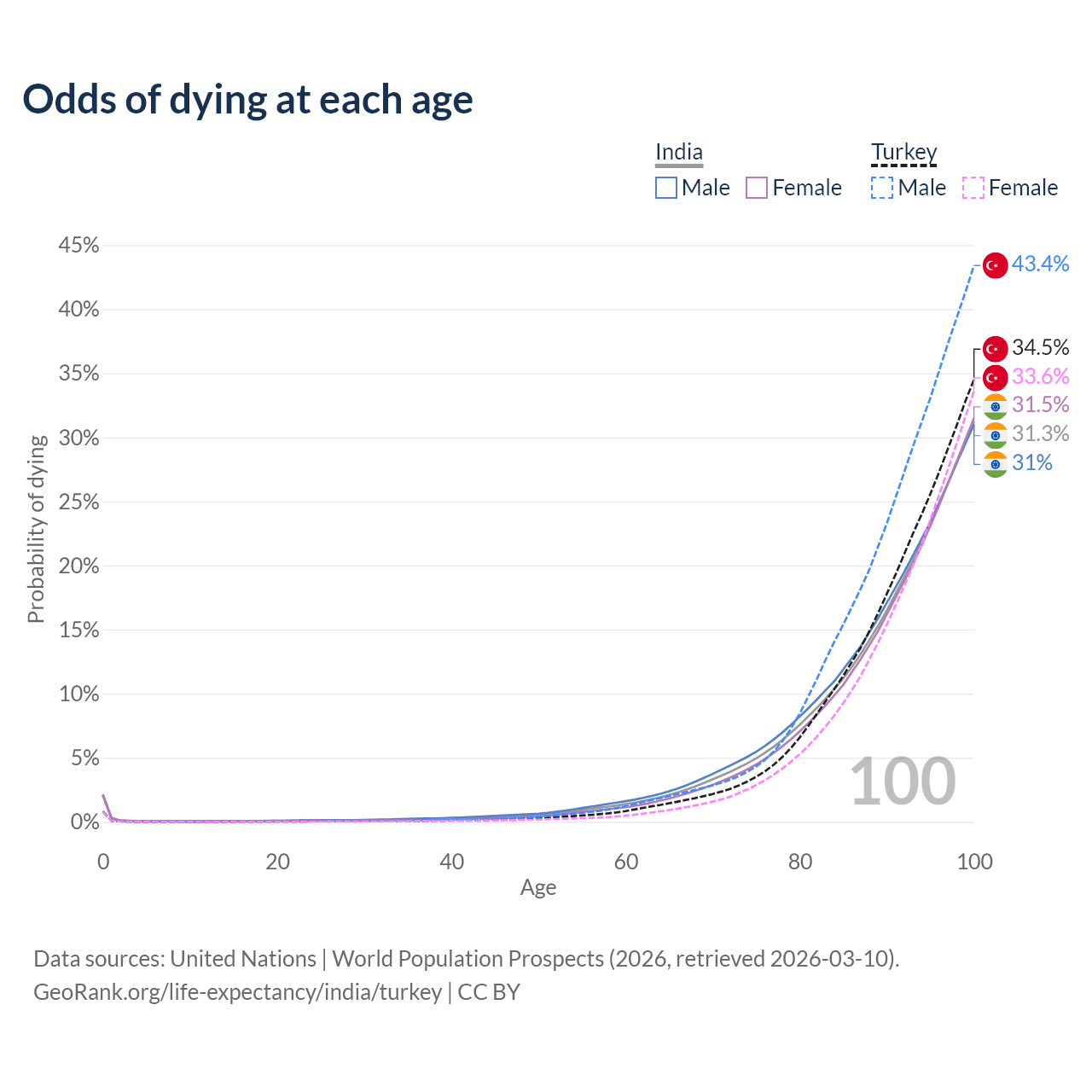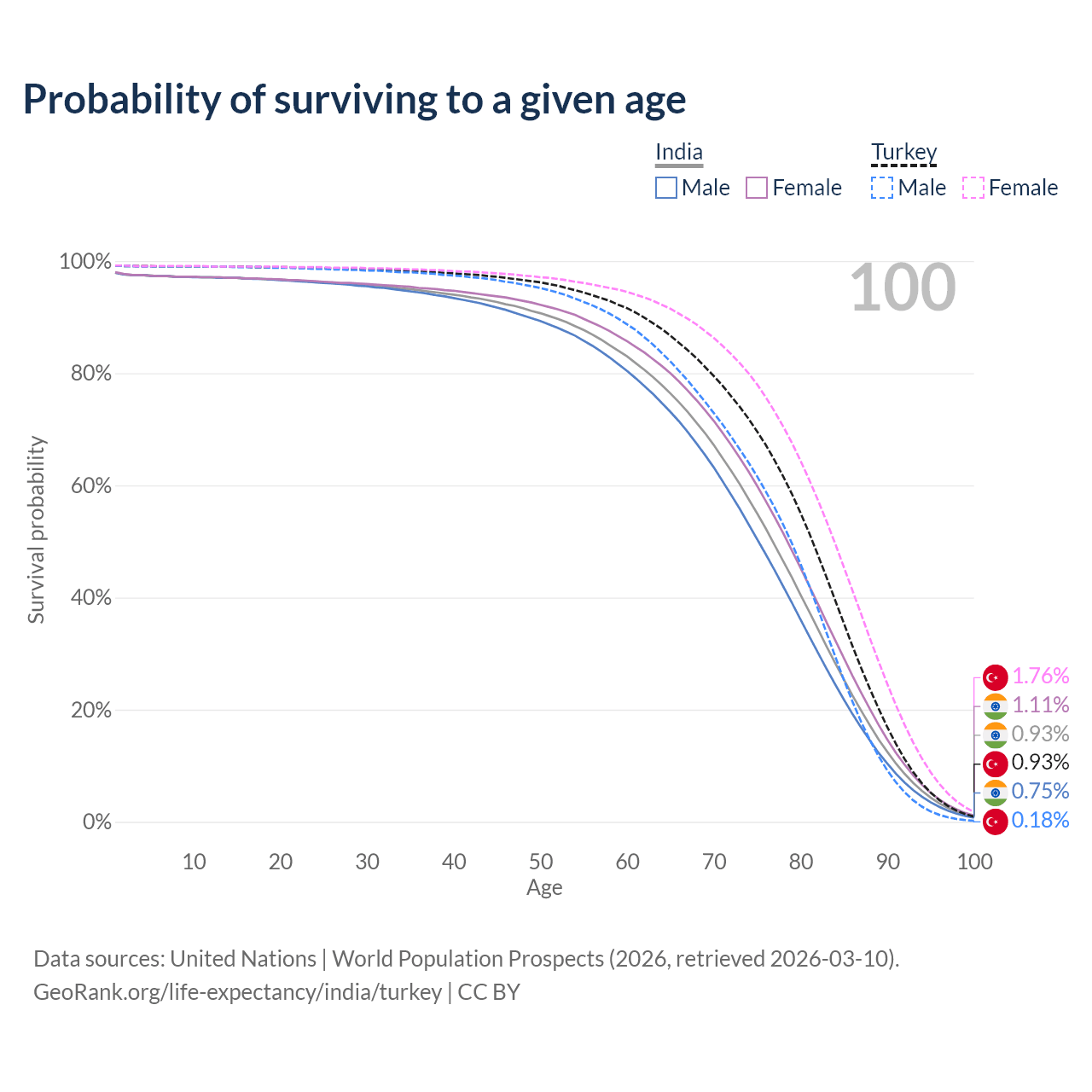 This life expectancy calculator shows the odds of living to 100, 95, 90, and below based on current age for both males and females in India and Turkey, along with mean and median age of death. The calculations are based on the 2026 life tables (actuarial tables) from the UN World Population Prospects.