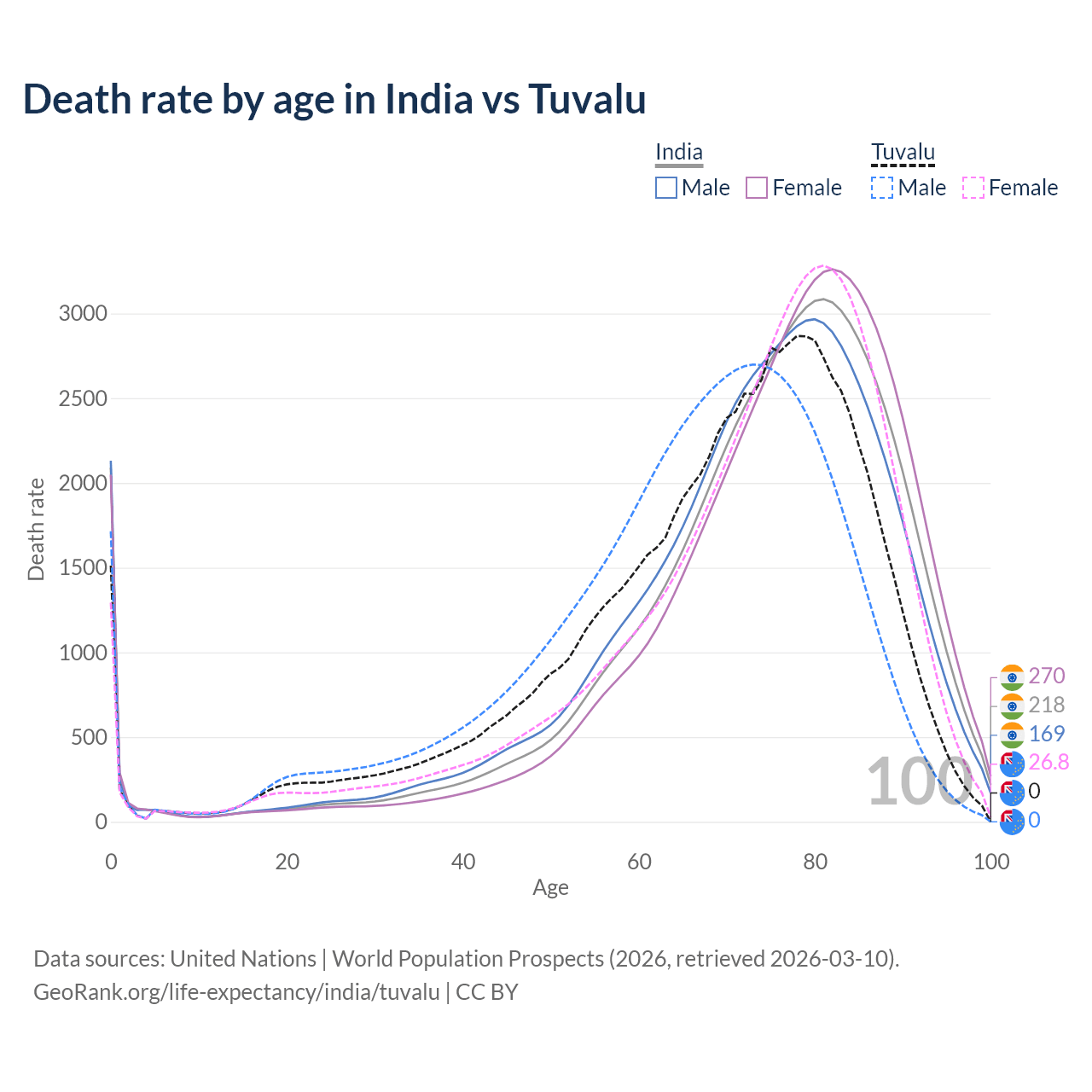 In India, the most common age of death is 81, compared to 78 in Tuvalu. The median age of death is 76.8 in India and 71.9 in Tuvalu, meaning only half of each cohort is expected to live past that age.