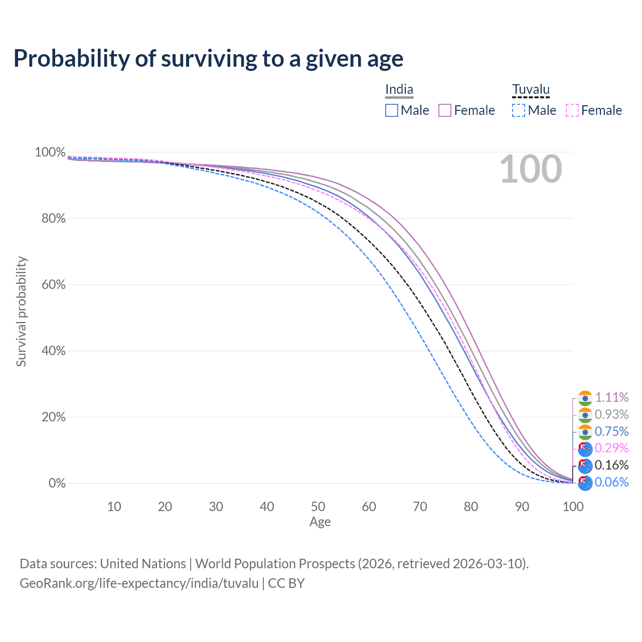 This life expectancy calculator shows the odds of living to 100, 95, 90, and below based on current age for both males and females in India and Tuvalu, along with mean and median age of death. The calculations are based on the 2026 life tables (actuarial tables) from the UN World Population Prospects.