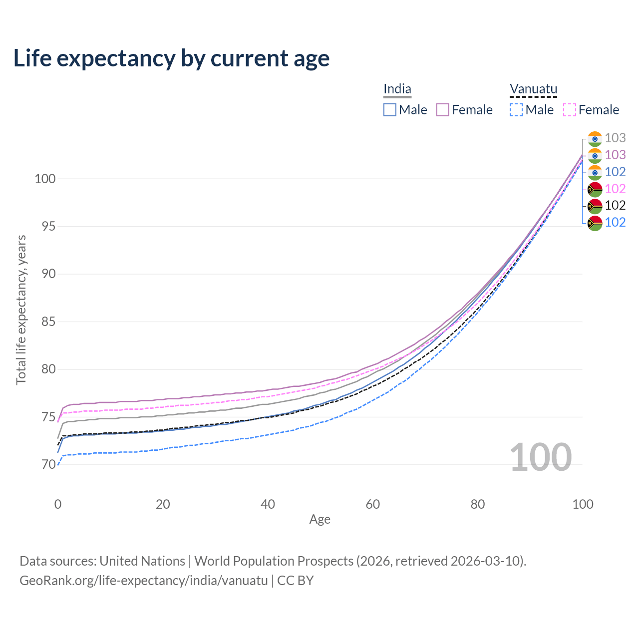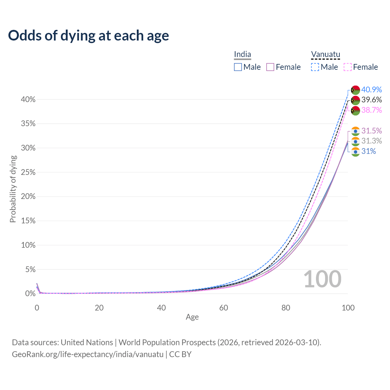 This life expectancy calculator shows the odds of living to 100, 95, 90, and below based on current age for both males and females in India and Vanuatu, along with mean and median age of death. The calculations are based on the 2026 life tables (actuarial tables) from the UN World Population Prospects.