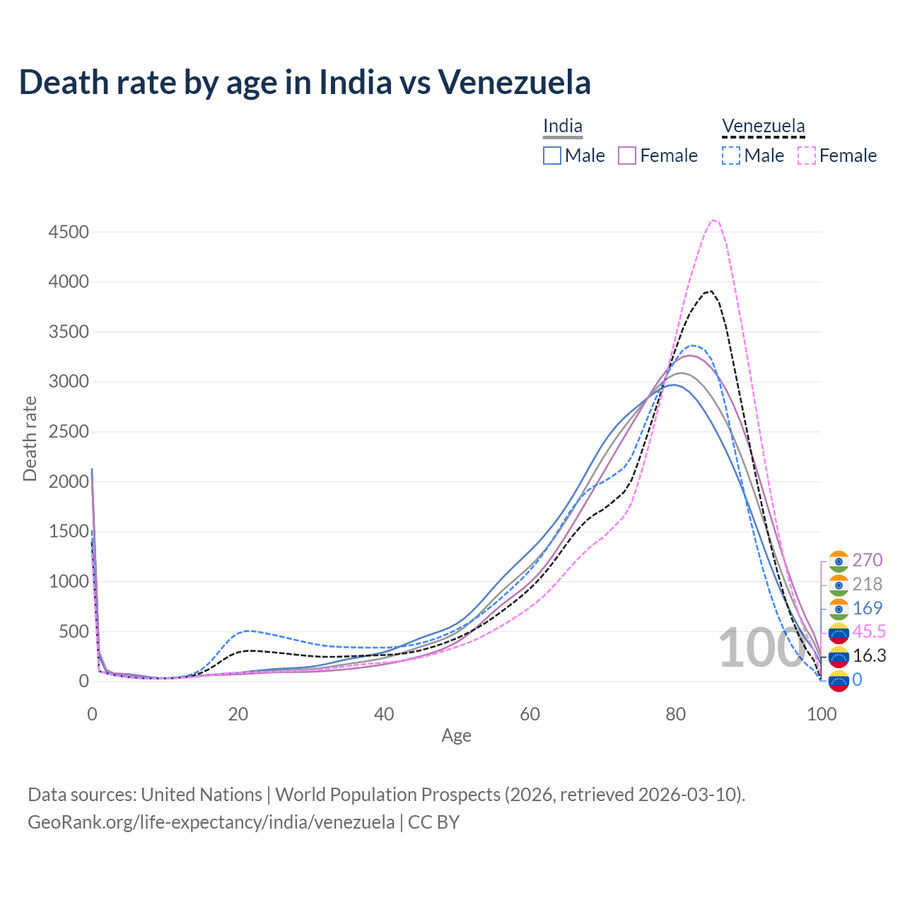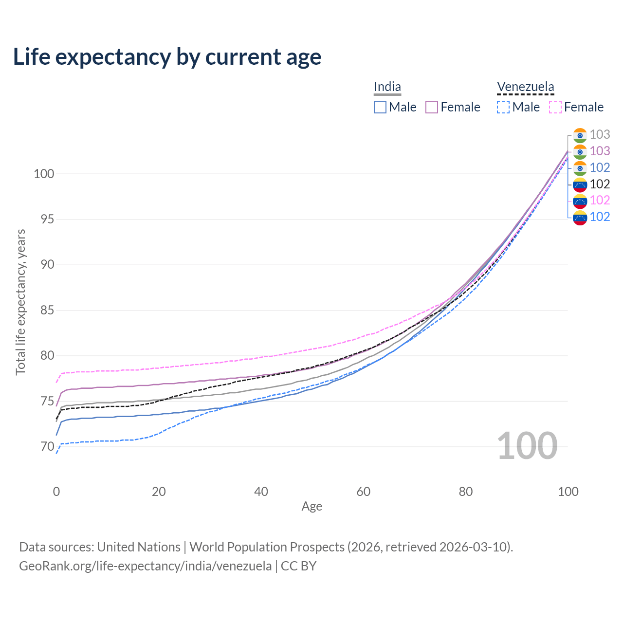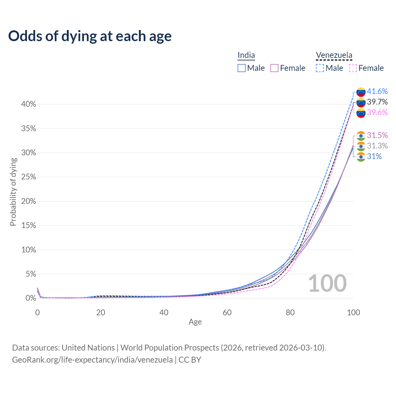 This life expectancy calculator shows the odds of living to 100, 95, 90, and below based on current age for both males and females in India and Venezuela, along with mean and median age of death. The calculations are based on the 2026 life tables (actuarial tables) from the UN World Population Prospects.