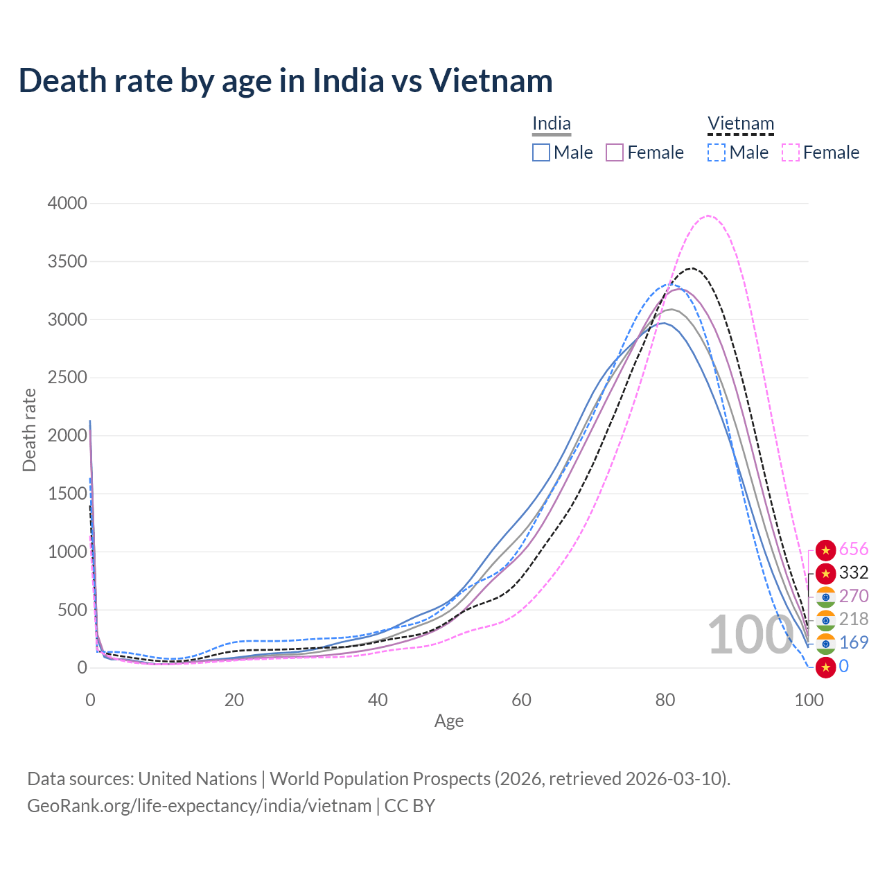 In India, the most common age of death is 81, compared to 84 in Vietnam. The median age of death is 76.8 in India and 79.9 in Vietnam, meaning only half of each cohort is expected to live past that age.