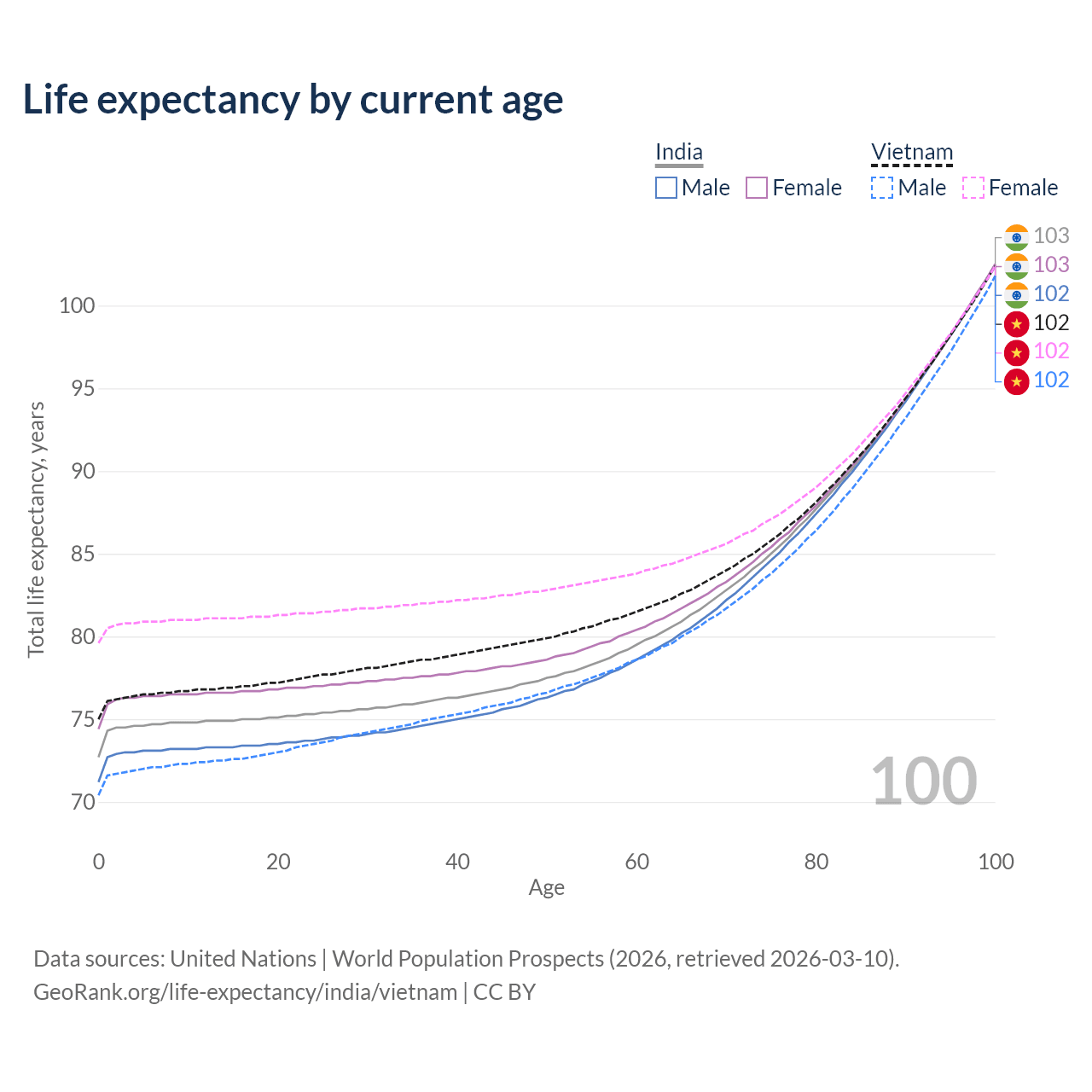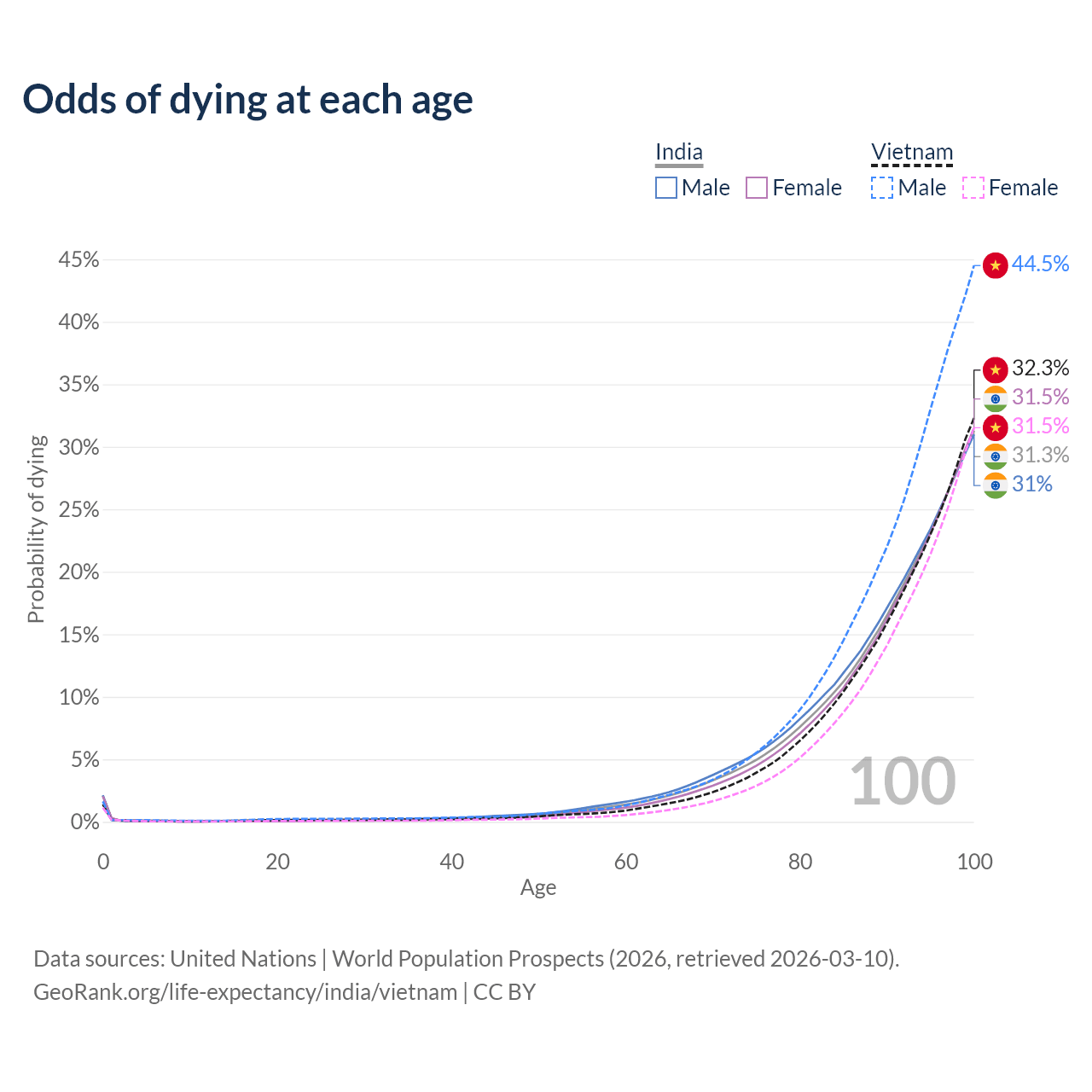 This life expectancy calculator shows the odds of living to 100, 95, 90, and below based on current age for both males and females in India and Vietnam, along with mean and median age of death. The calculations are based on the 2026 life tables (actuarial tables) from the UN World Population Prospects.