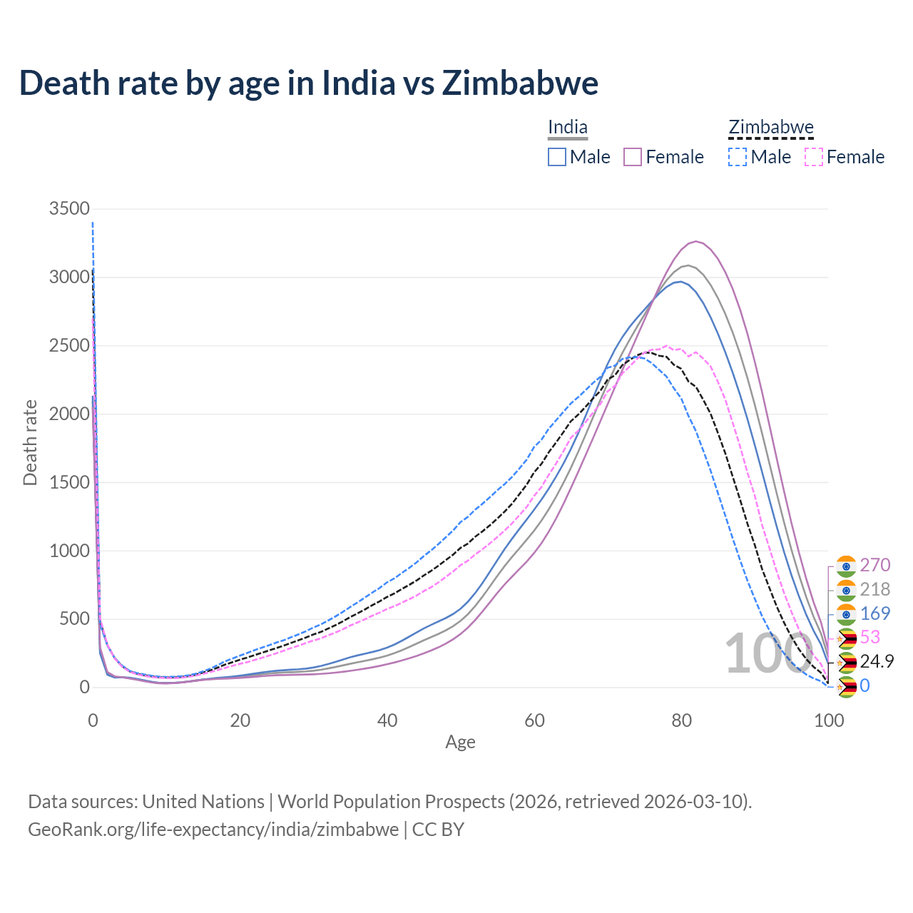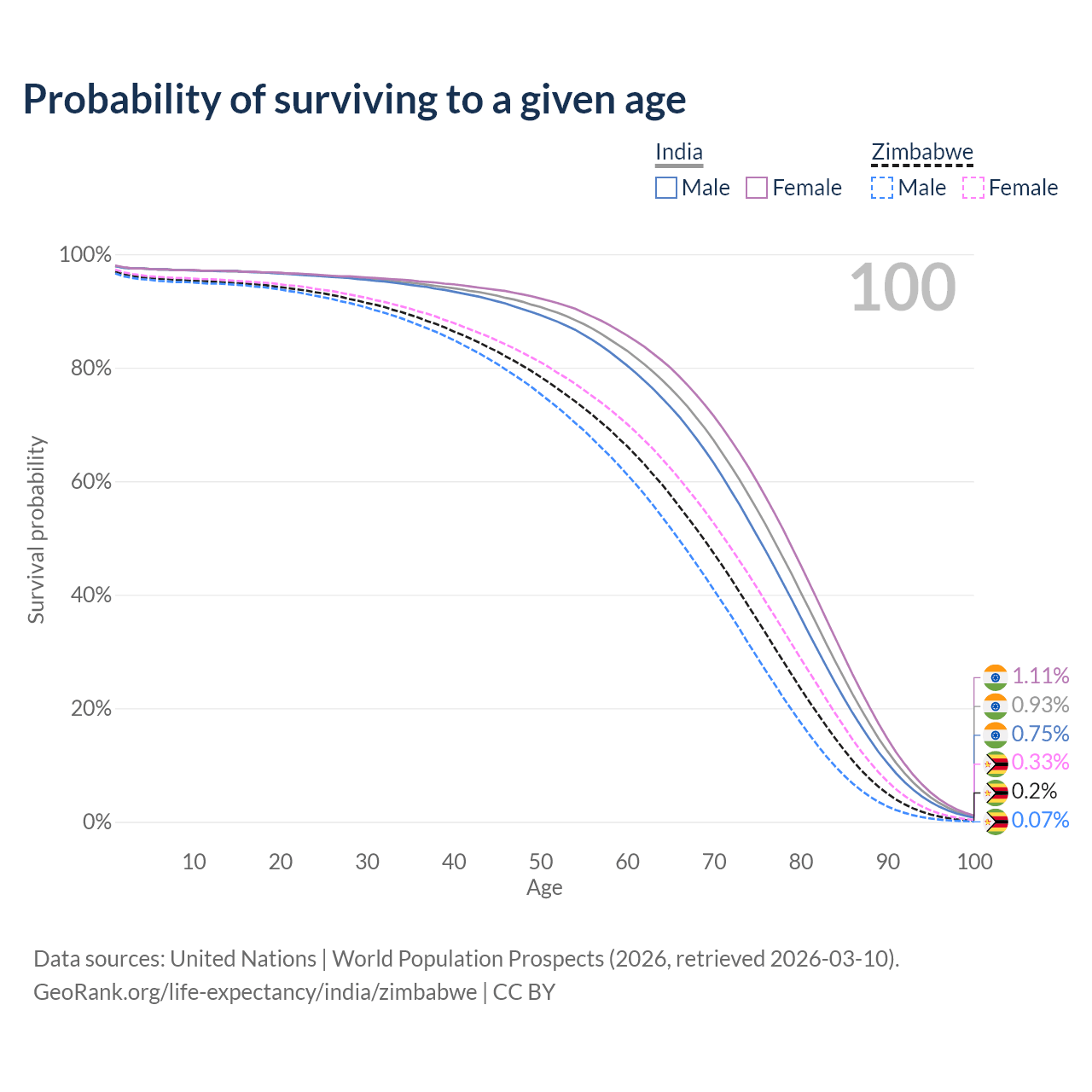 This life expectancy calculator shows the odds of living to 100, 95, 90, and below based on current age for both males and females in India and Zimbabwe, along with mean and median age of death. The calculations are based on the 2026 life tables (actuarial tables) from the UN World Population Prospects.