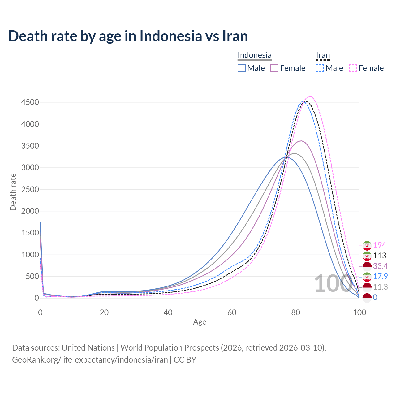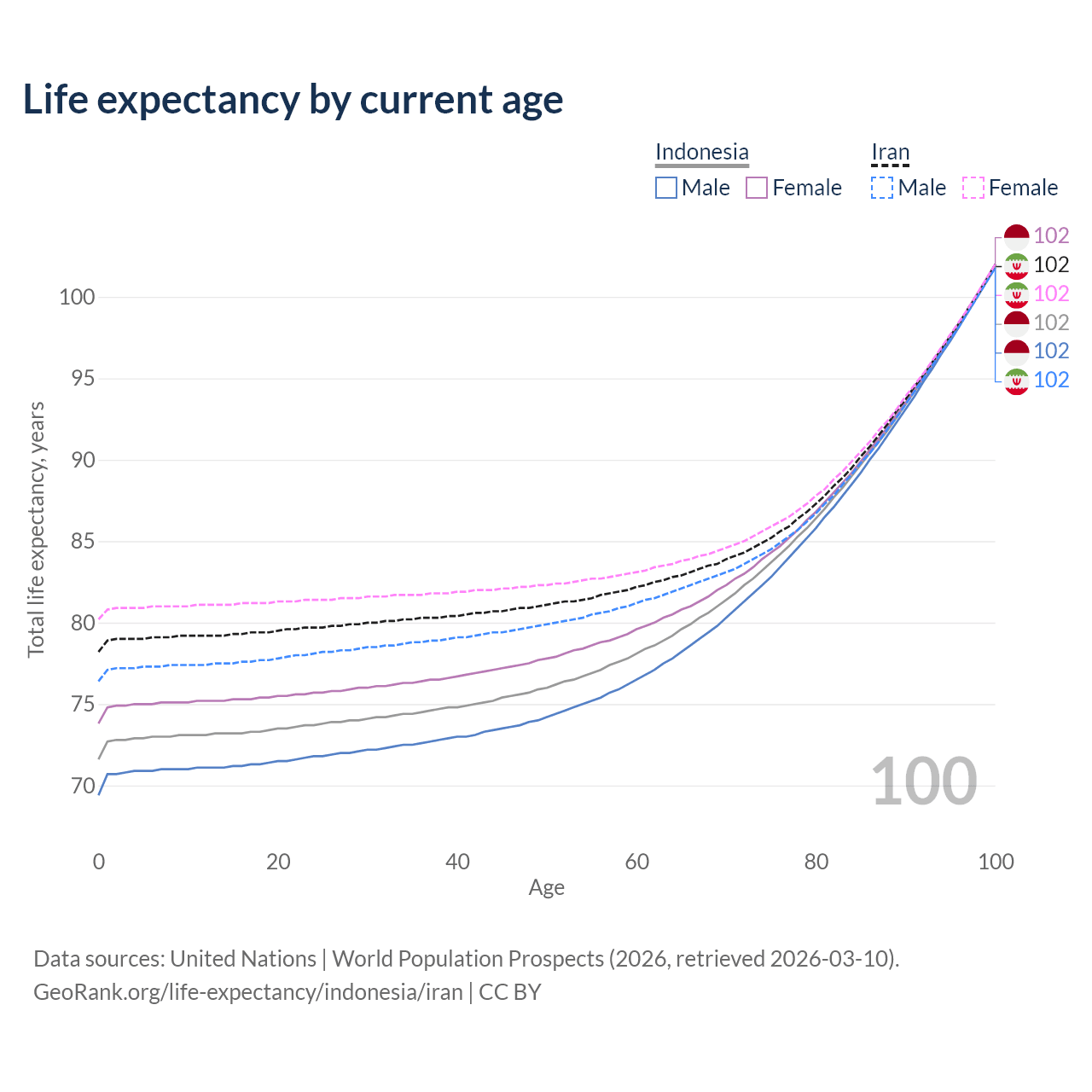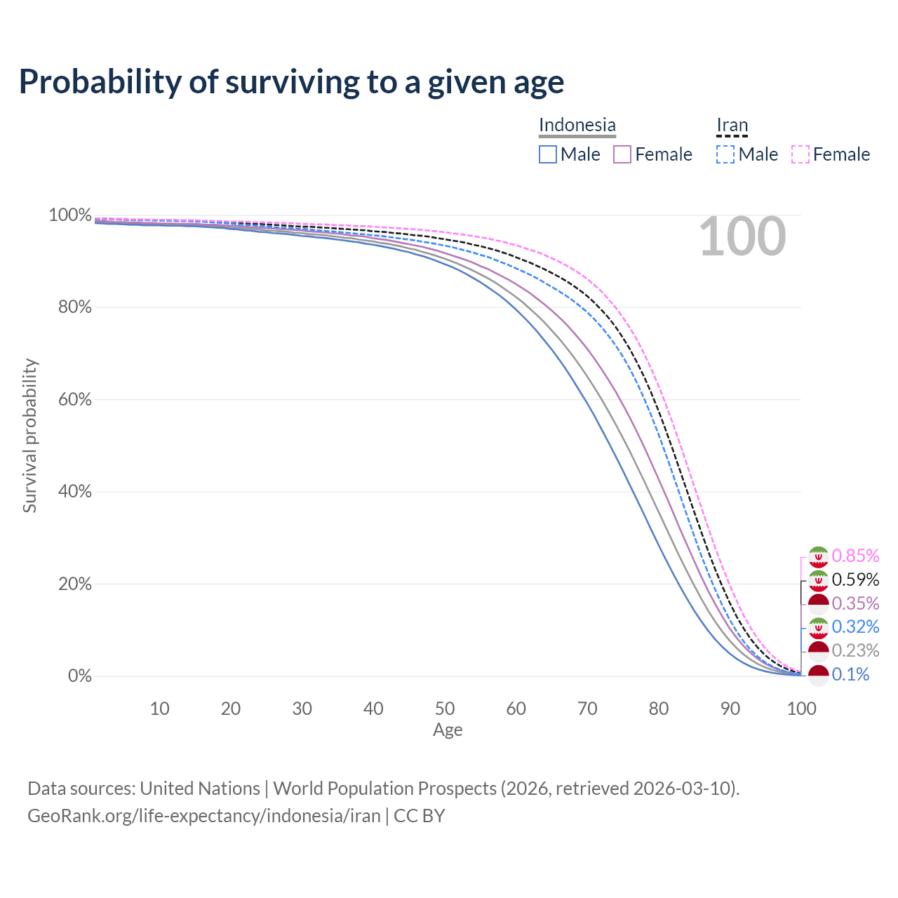 This life expectancy calculator shows the odds of living to 100, 95, 90, and below based on current age for both males and females in Indonesia and Iran, along with mean and median age of death. The calculations are based on the 2026 life tables (actuarial tables) from the UN World Population Prospects.