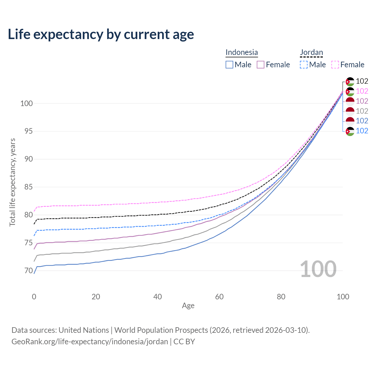 This life expectancy calculator shows the odds of living to 100, 95, 90, and below based on current age for both males and females in Indonesia and Jordan, along with mean and median age of death. The calculations are based on the 2026 life tables (actuarial tables) from the UN World Population Prospects.