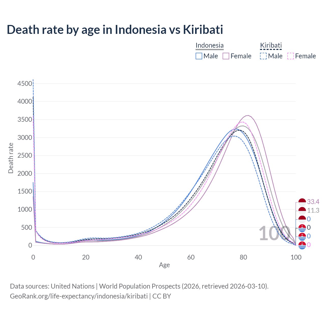 In Indonesia, the most common age of death is 80, compared to 0 in Kiribati. The median age of death is 75.6 in Indonesia and 73.1 in Kiribati, meaning only half of each cohort is expected to live past that age.