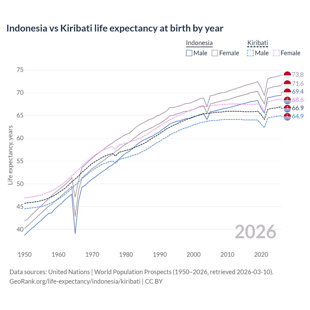 The average life expectancy at birth is 71.6 years in Indonesia vs 66.9 in Kiribati. Indonesia is ranked 130/197 by life expectancy, and Kiribati is 162/197. In Indonesia, the life expectancy is 69.4 years for males and 73.8 years for females. In Kiribati, it's 64.9 years for males and 68.6 years for females.