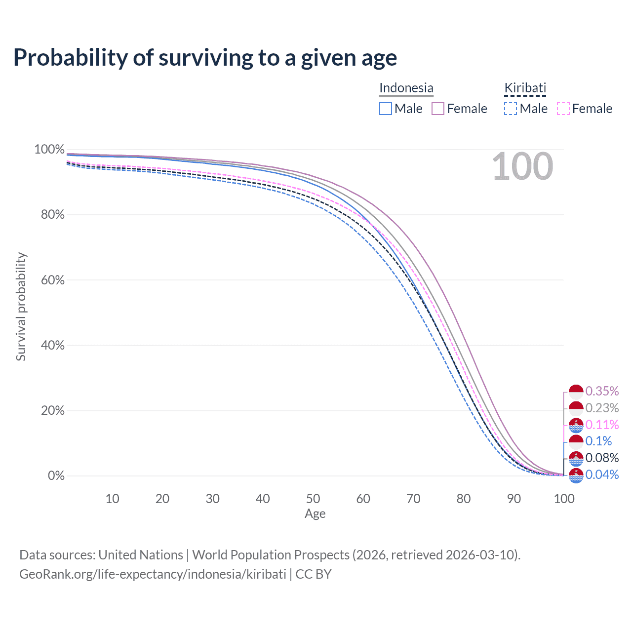 This life expectancy calculator shows the odds of living to 100, 95, 90, and below based on current age for both males and females in Indonesia and Kiribati, along with mean and median age of death. The calculations are based on the 2026 life tables (actuarial tables) from the UN World Population Prospects.