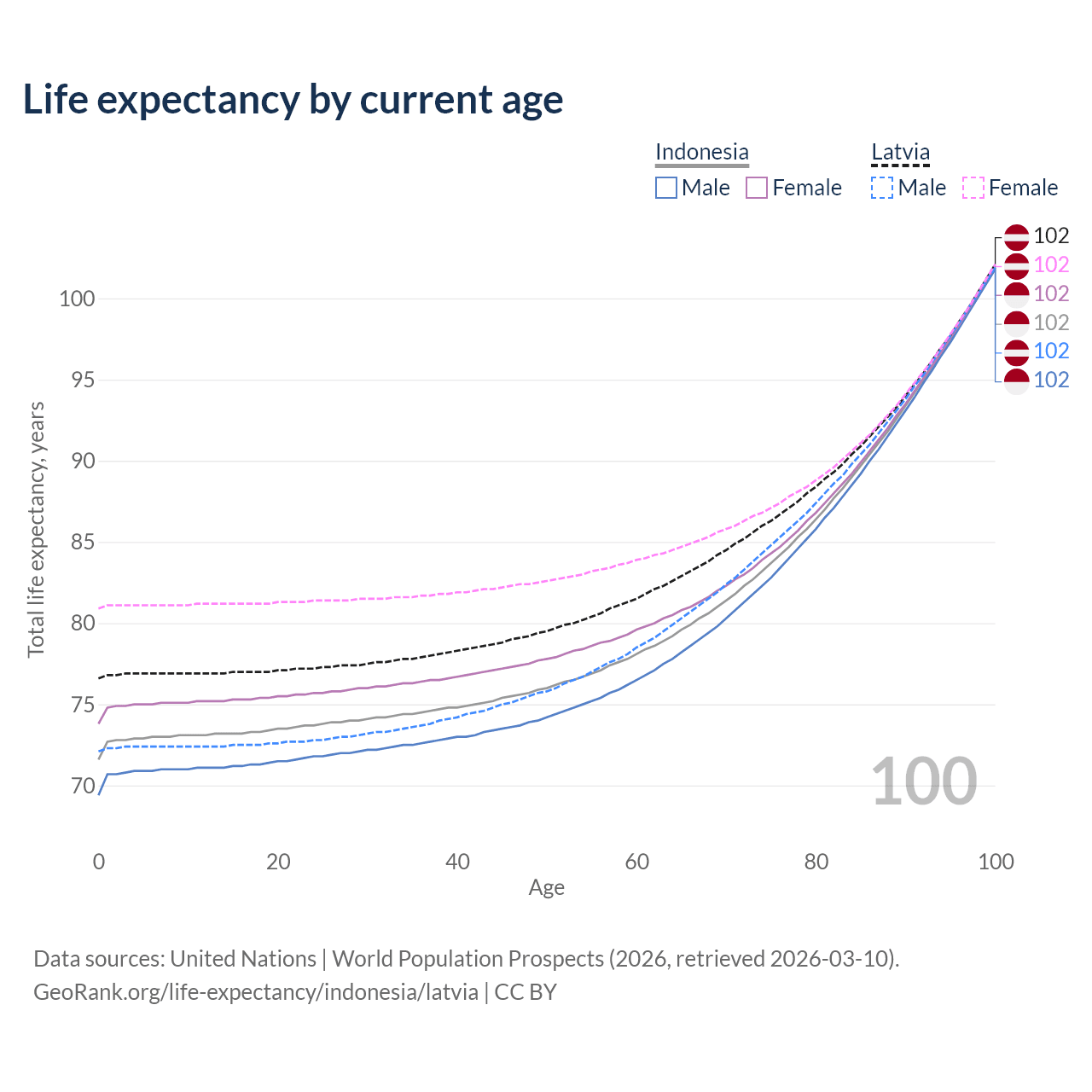 This life expectancy calculator shows the odds of living to 100, 95, 90, and below based on current age for both males and females in Indonesia and Latvia, along with mean and median age of death. The calculations are based on the 2026 life tables (actuarial tables) from the UN World Population Prospects.