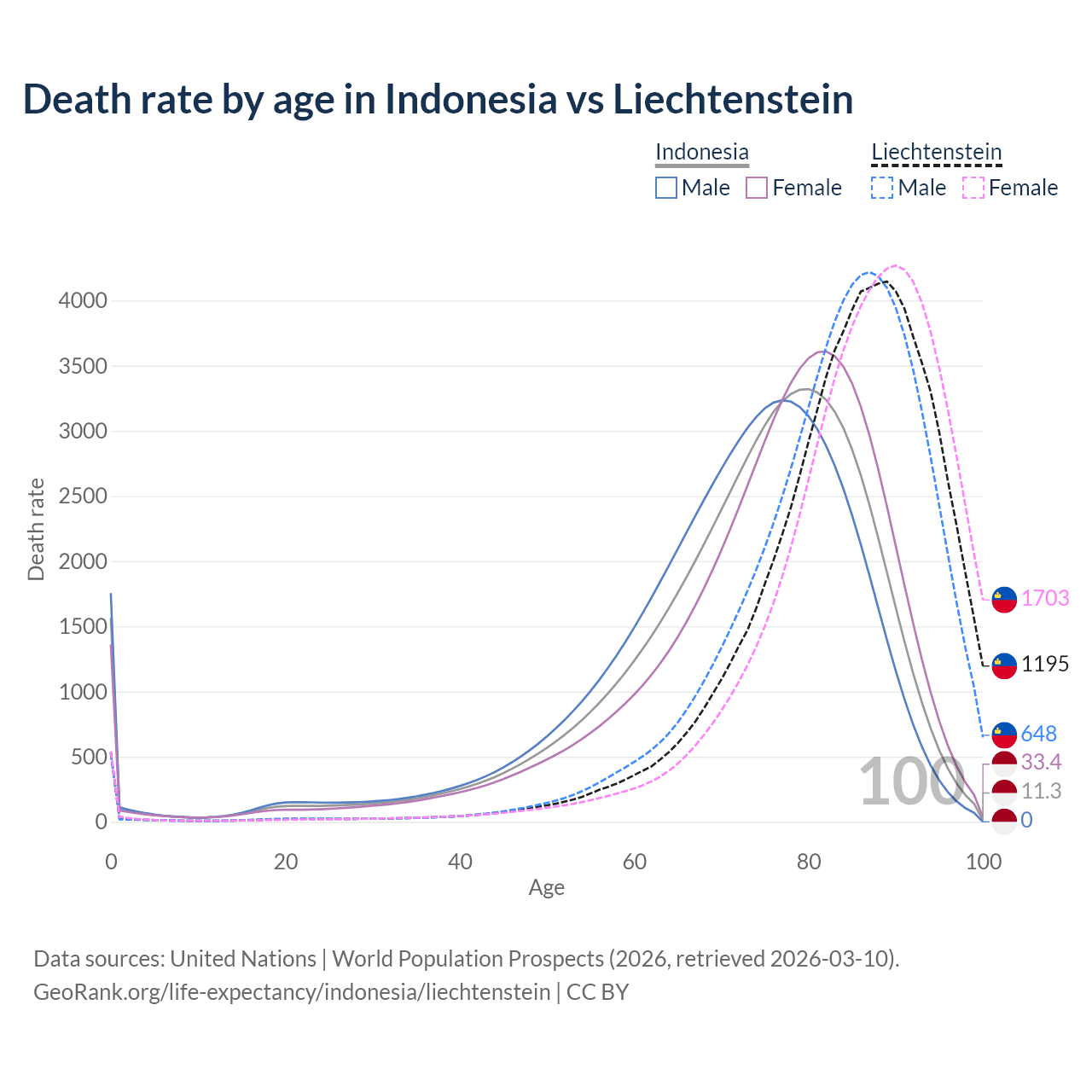 In Indonesia, the most common age of death is 80, compared to 89 in Liechtenstein. The median age of death is 75.6 in Indonesia and 86.3 in Liechtenstein, meaning only half of each cohort is expected to live past that age.