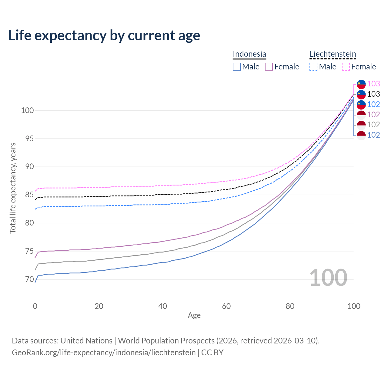 This life expectancy calculator shows the odds of living to 100, 95, 90, and below based on current age for both males and females in Indonesia and Liechtenstein, along with mean and median age of death. The calculations are based on the 2026 life tables (actuarial tables) from the UN World Population Prospects.