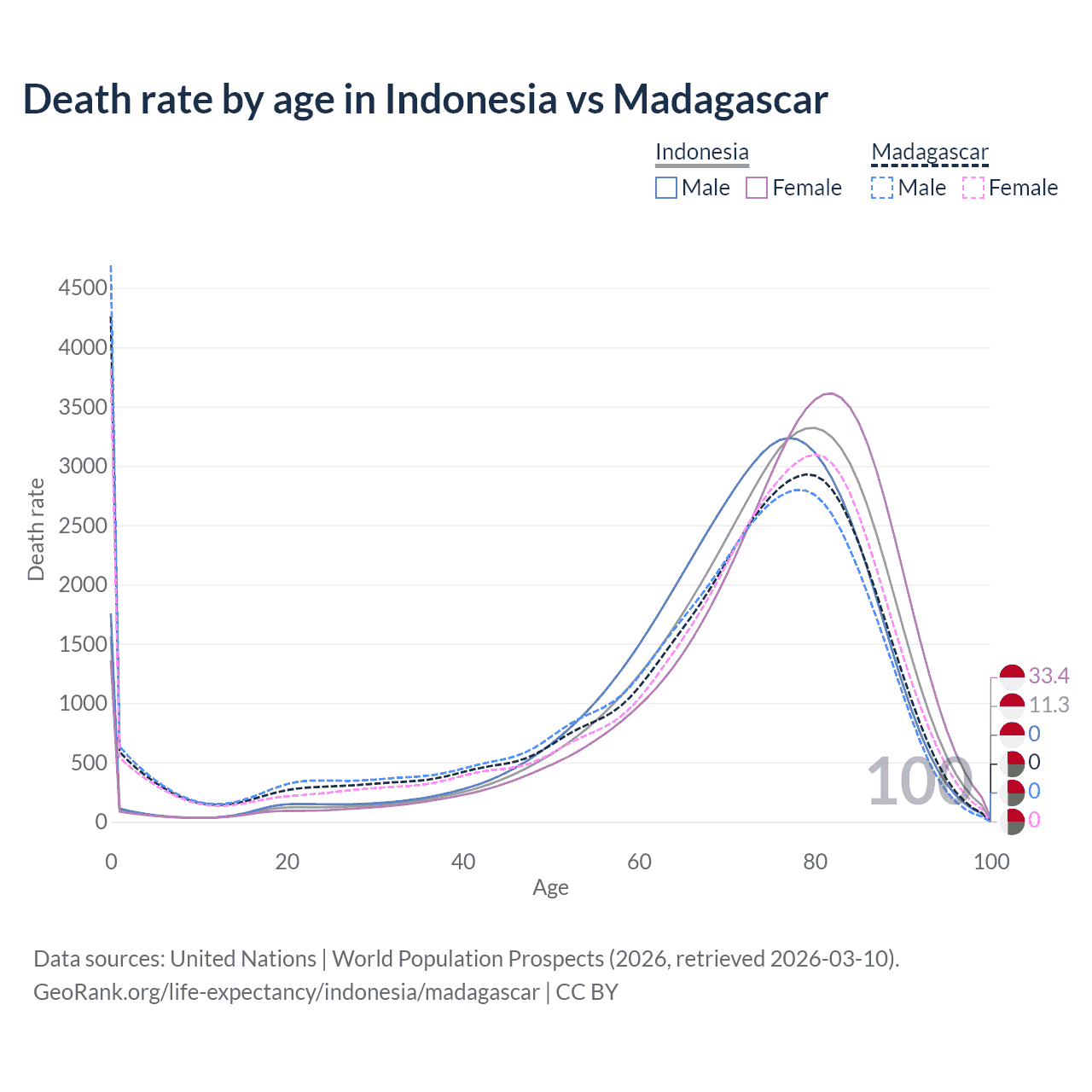 In Indonesia, the most common age of death is 80, compared to 0 in Madagascar. The median age of death is 75.6 in Indonesia and 72.2 in Madagascar, meaning only half of each cohort is expected to live past that age.