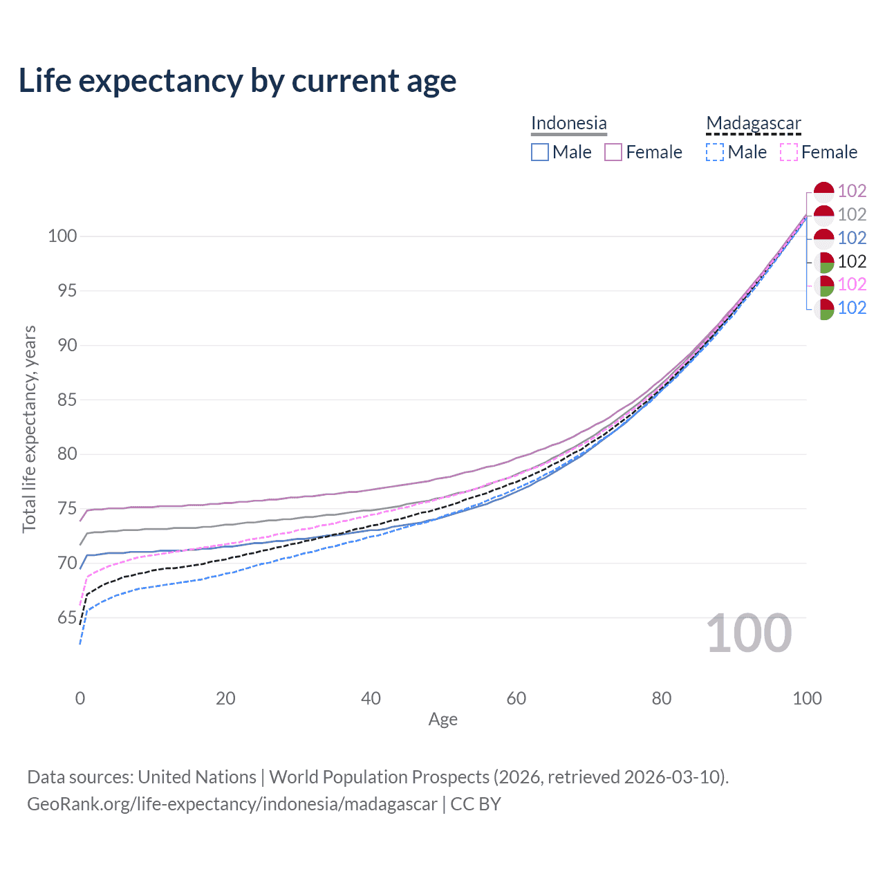 This life expectancy calculator shows the odds of living to 100, 95, 90, and below based on current age for both males and females in Indonesia and Madagascar, along with mean and median age of death. The calculations are based on the 2026 life tables (actuarial tables) from the UN World Population Prospects.