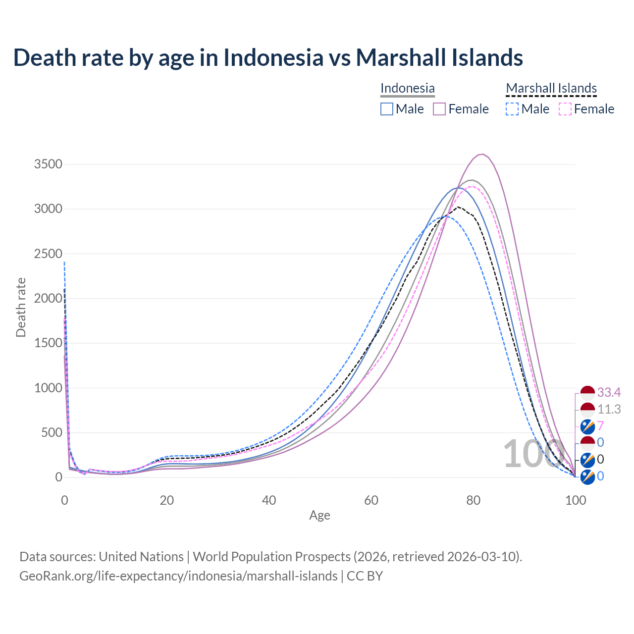 In Indonesia, the most common age of death is 80, compared to 77 in the Marshall Islands. The median age of death is 75.6 in Indonesia and 72 in the Marshall Islands, meaning only half of each cohort is expected to live past that age.