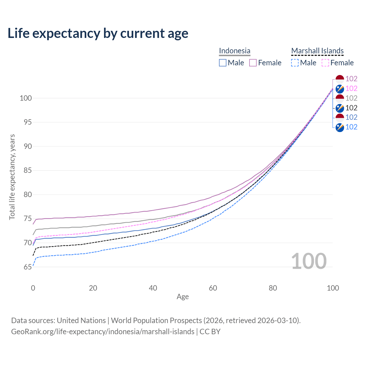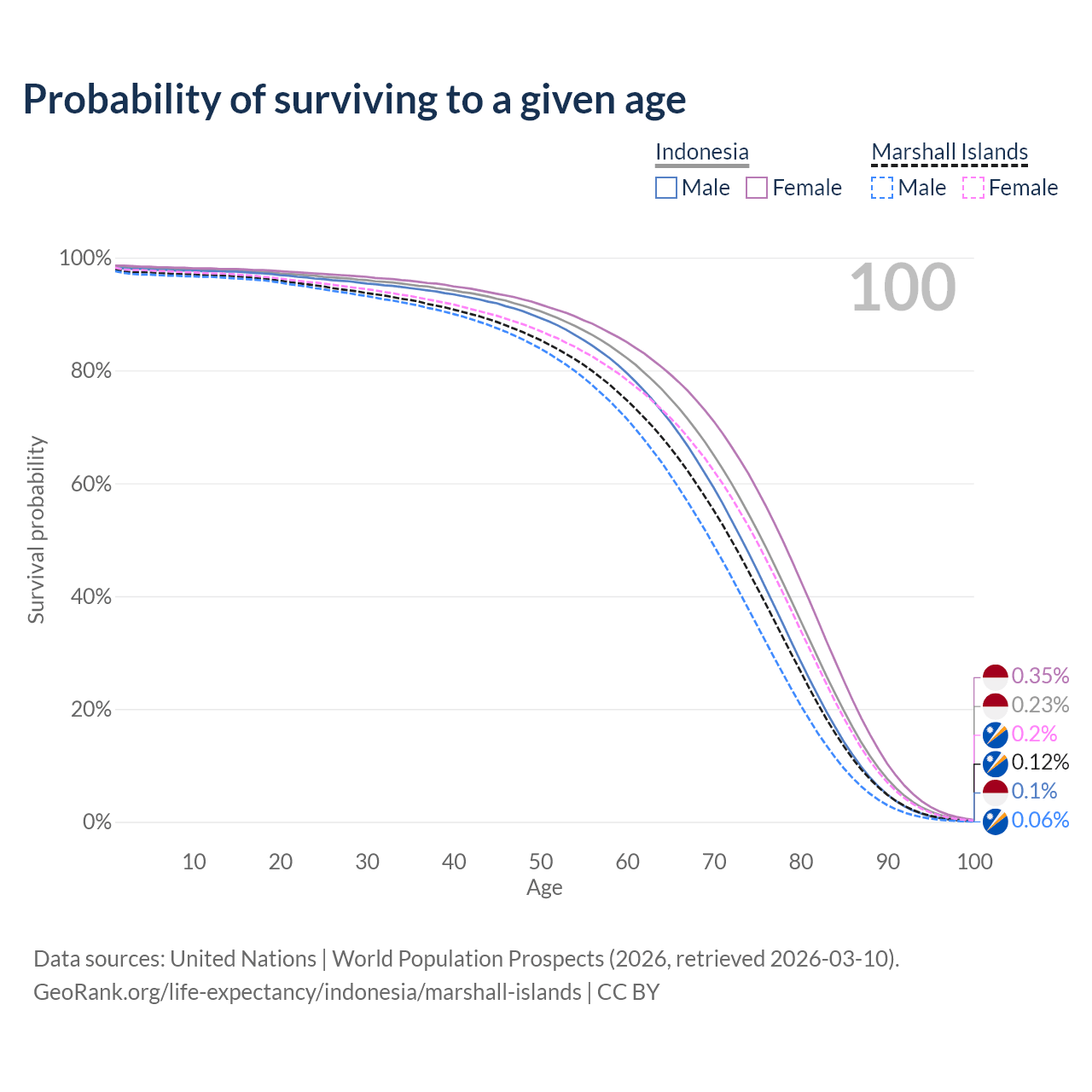 This life expectancy calculator shows the odds of living to 100, 95, 90, and below based on current age for both males and females in Indonesia and the Marshall Islands, along with mean and median age of death. The calculations are based on the 2026 life tables (actuarial tables) from the UN World Population Prospects.