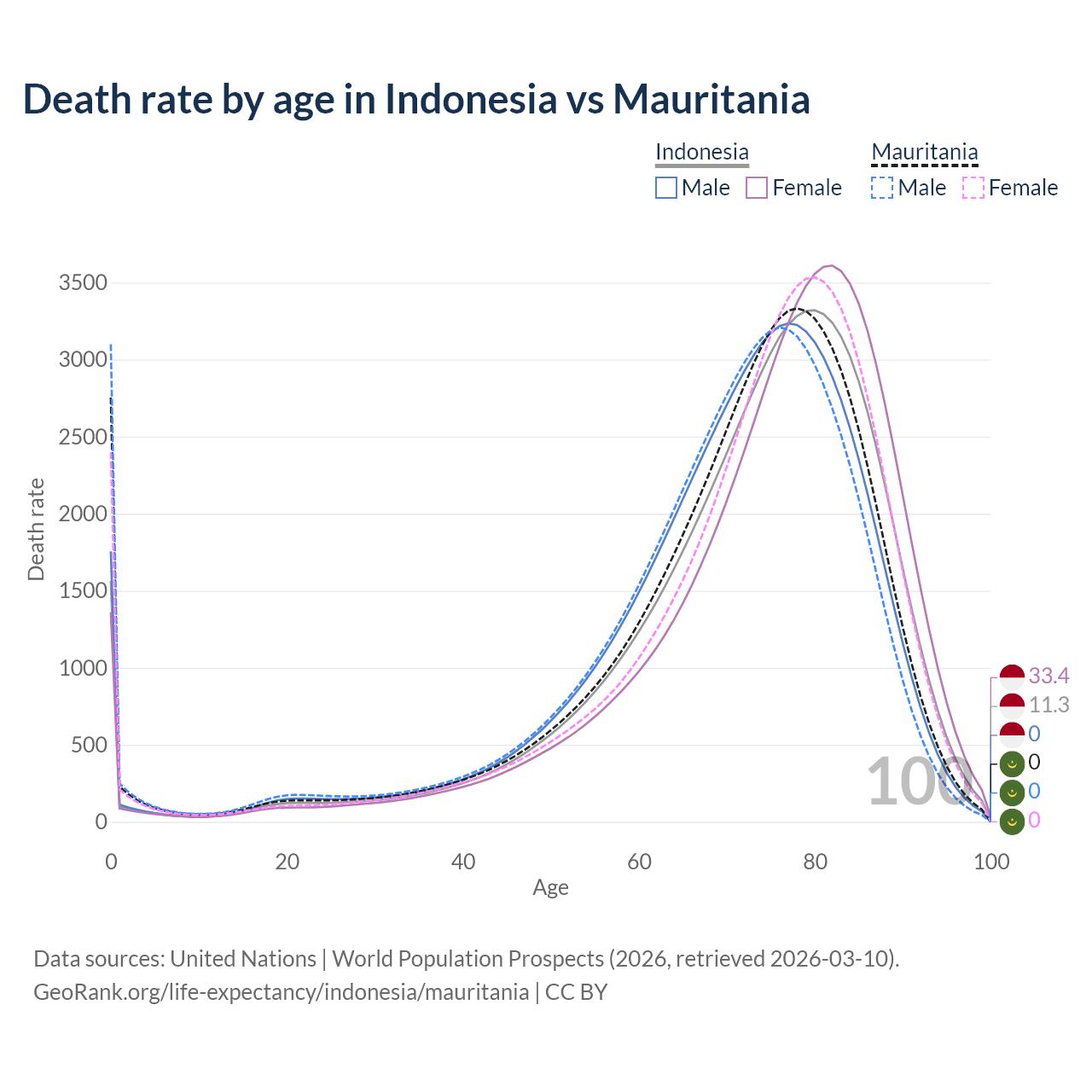 In Indonesia, the most common age of death is 80, compared to 78 in Mauritania. The median age of death is 75.6 in Indonesia and 74.1 in Mauritania, meaning only half of each cohort is expected to live past that age.
