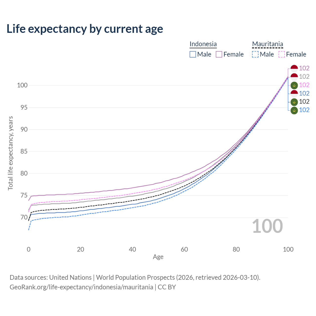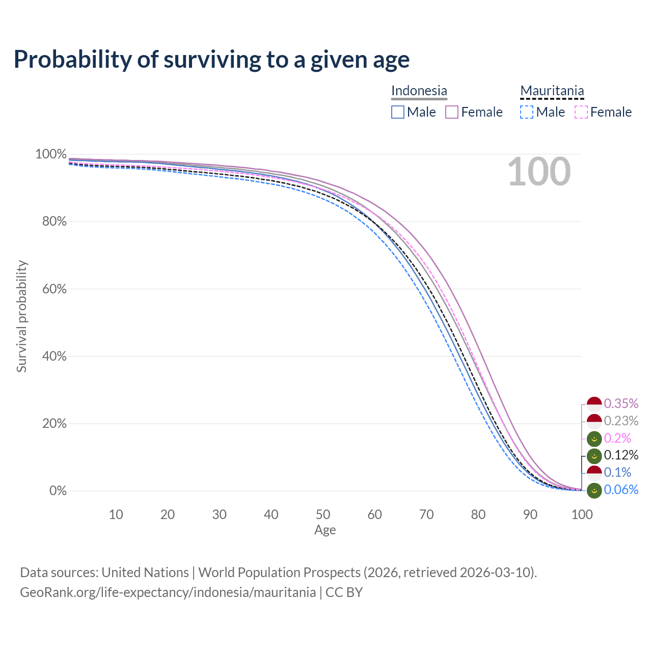 This life expectancy calculator shows the odds of living to 100, 95, 90, and below based on current age for both males and females in Indonesia and Mauritania, along with mean and median age of death. The calculations are based on the 2026 life tables (actuarial tables) from the UN World Population Prospects.