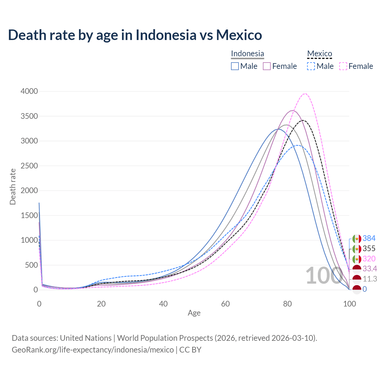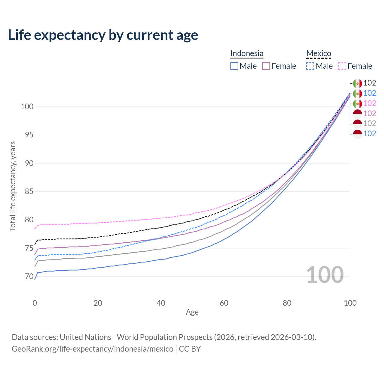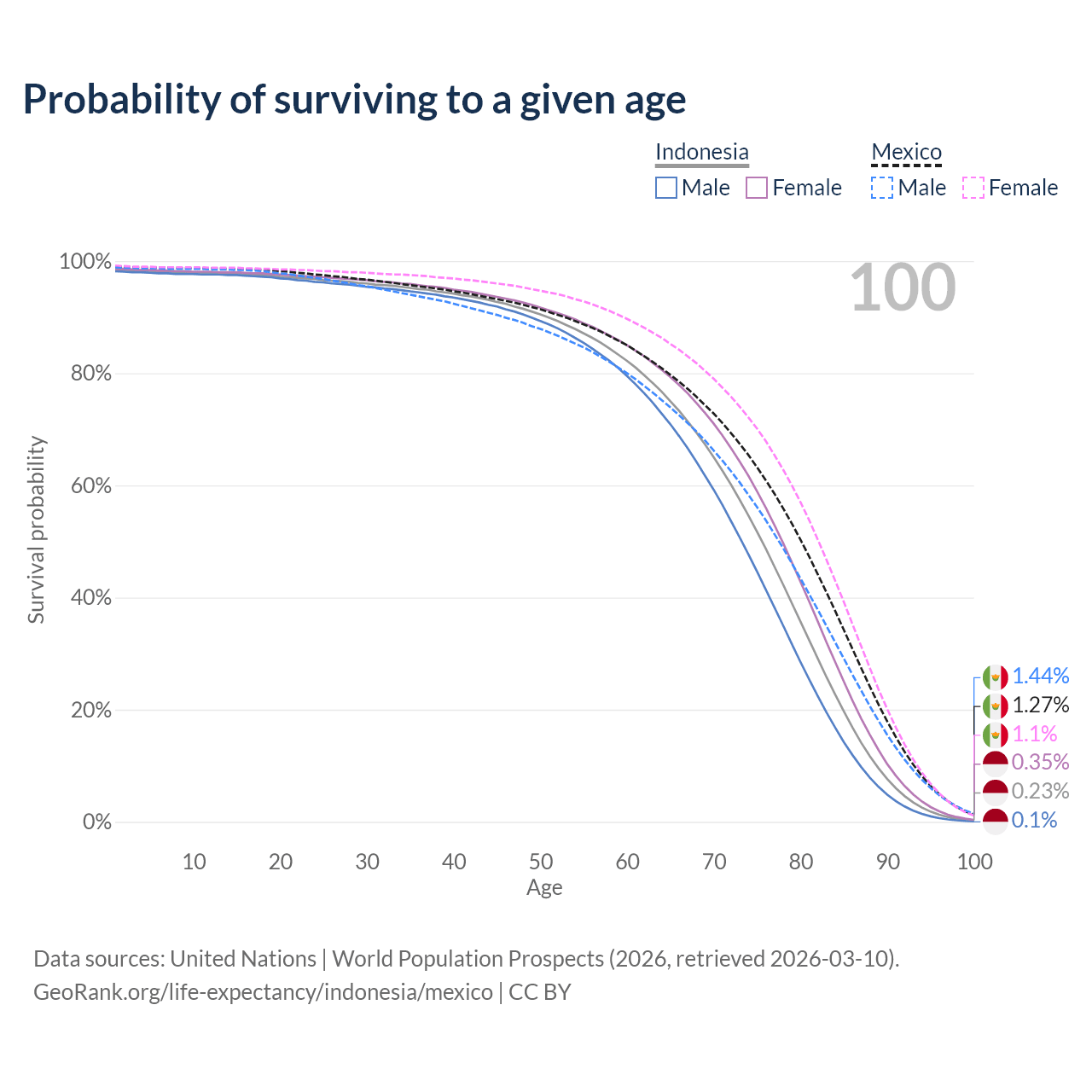 This life expectancy calculator shows the odds of living to 100, 95, 90, and below based on current age for both males and females in Indonesia and Mexico, along with mean and median age of death. The calculations are based on the 2026 life tables (actuarial tables) from the UN World Population Prospects.