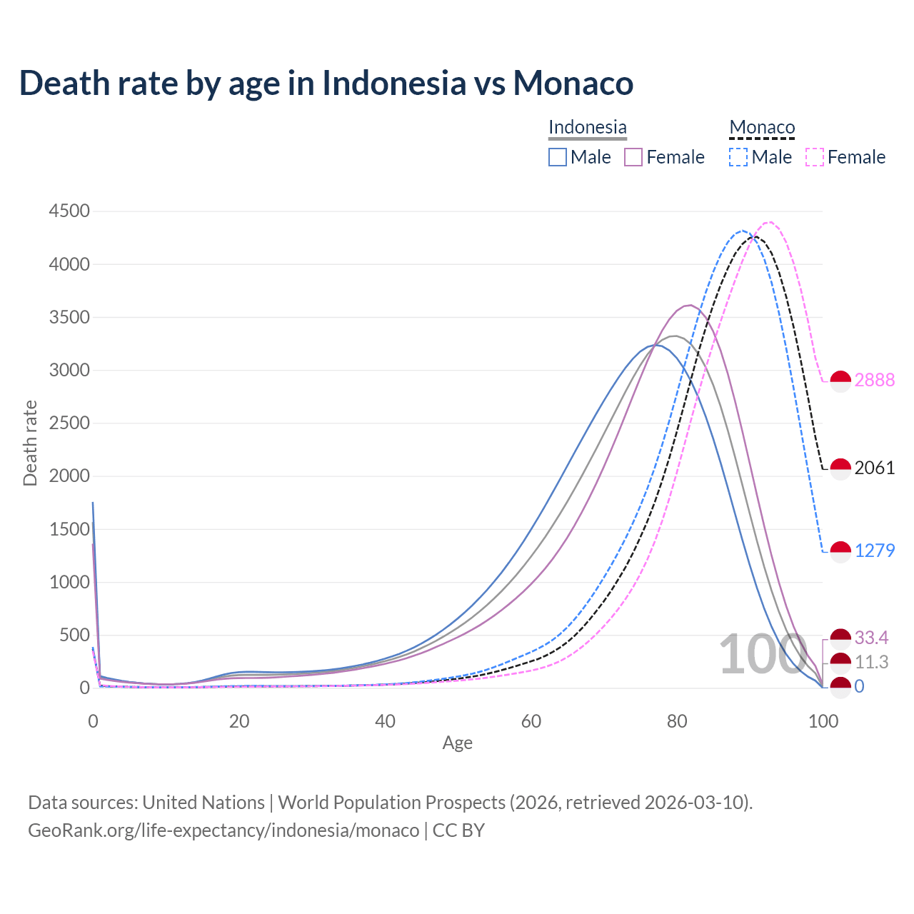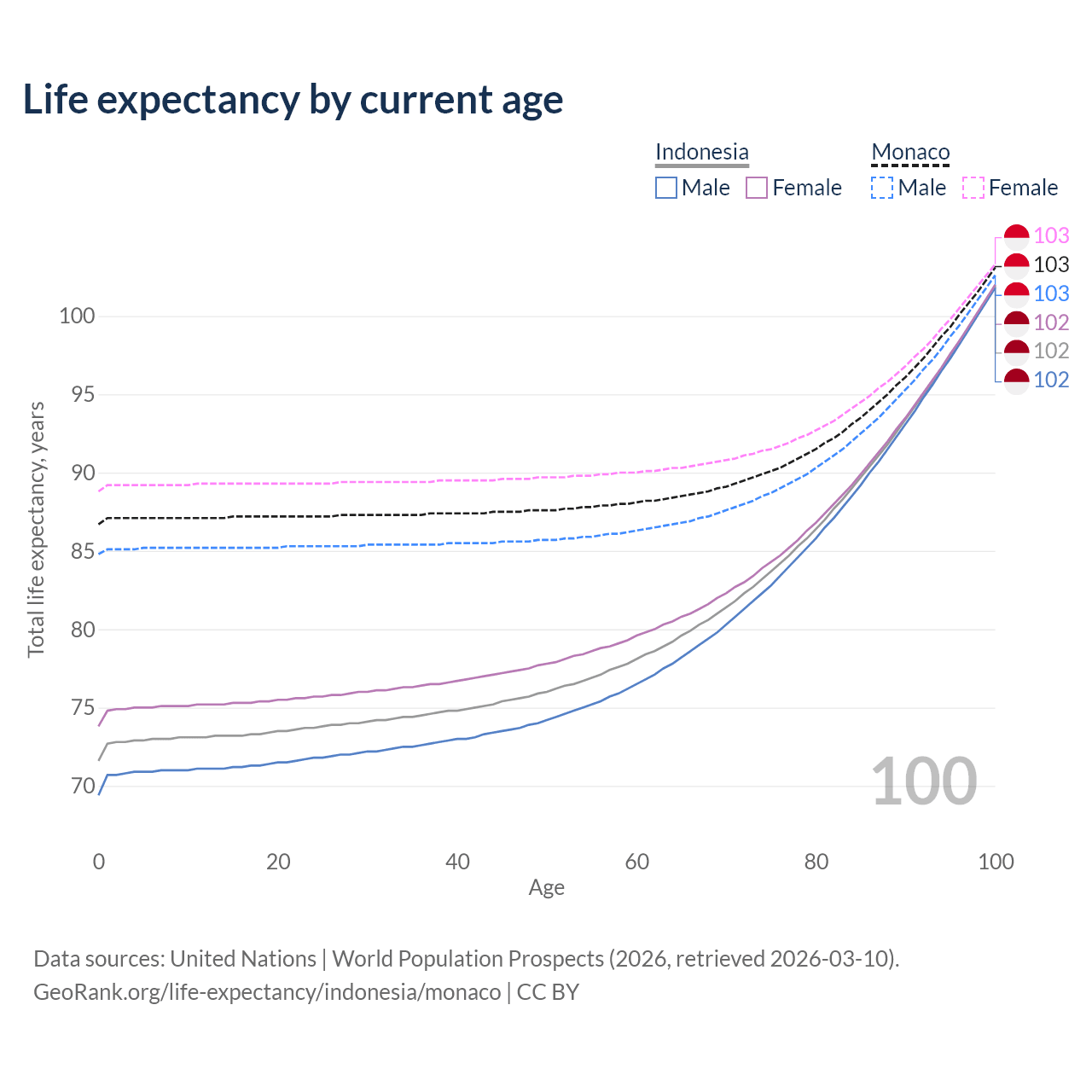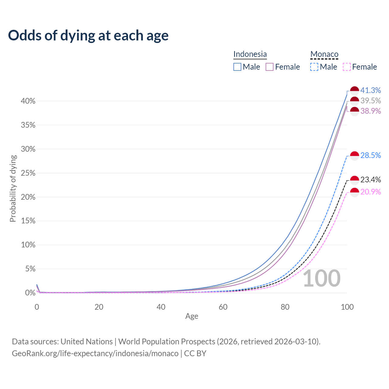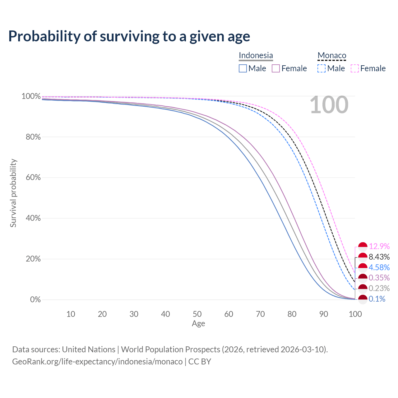 This life expectancy calculator shows the odds of living to 100, 95, 90, and below based on current age for both males and females in Indonesia and Monaco, along with mean and median age of death. The calculations are based on the 2026 life tables (actuarial tables) from the UN World Population Prospects.