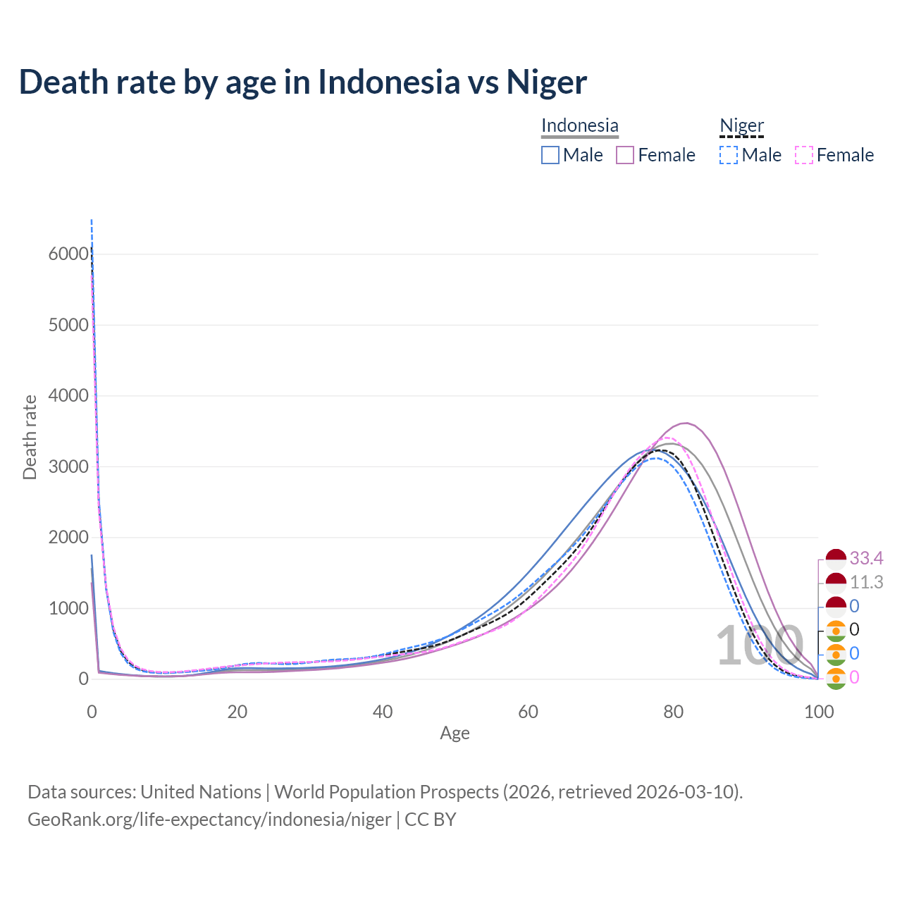In Indonesia, the most common age of death is 80, compared to 0 in Niger. The median age of death is 75.6 in Indonesia and 71.7 in Niger, meaning only half of each cohort is expected to live past that age.