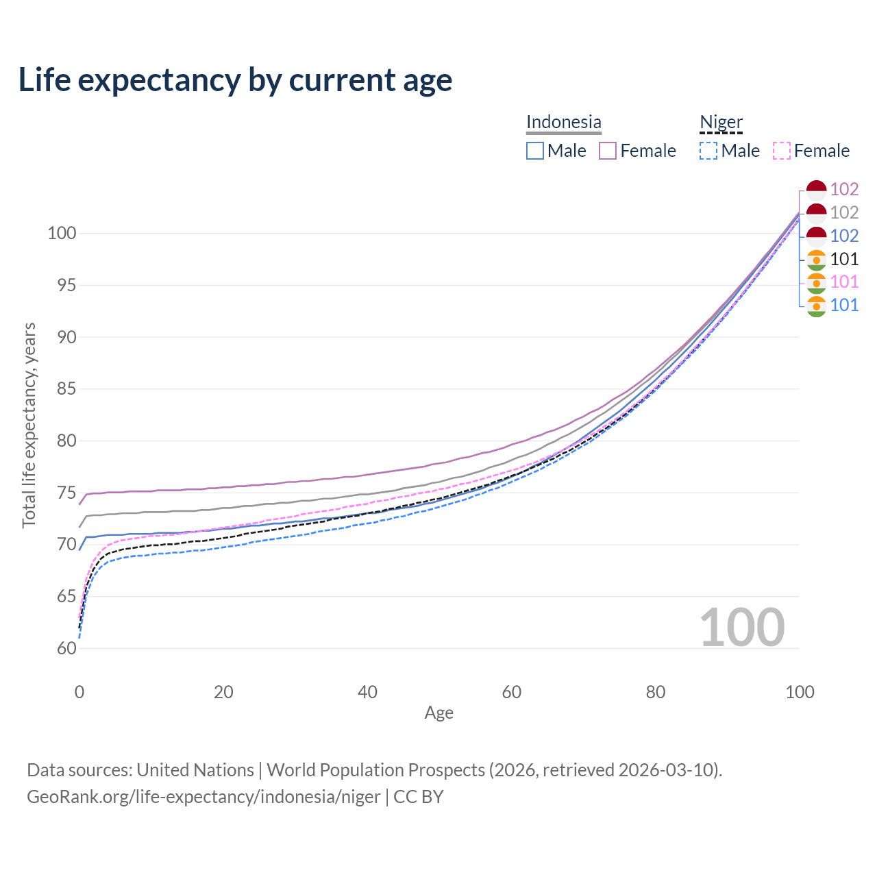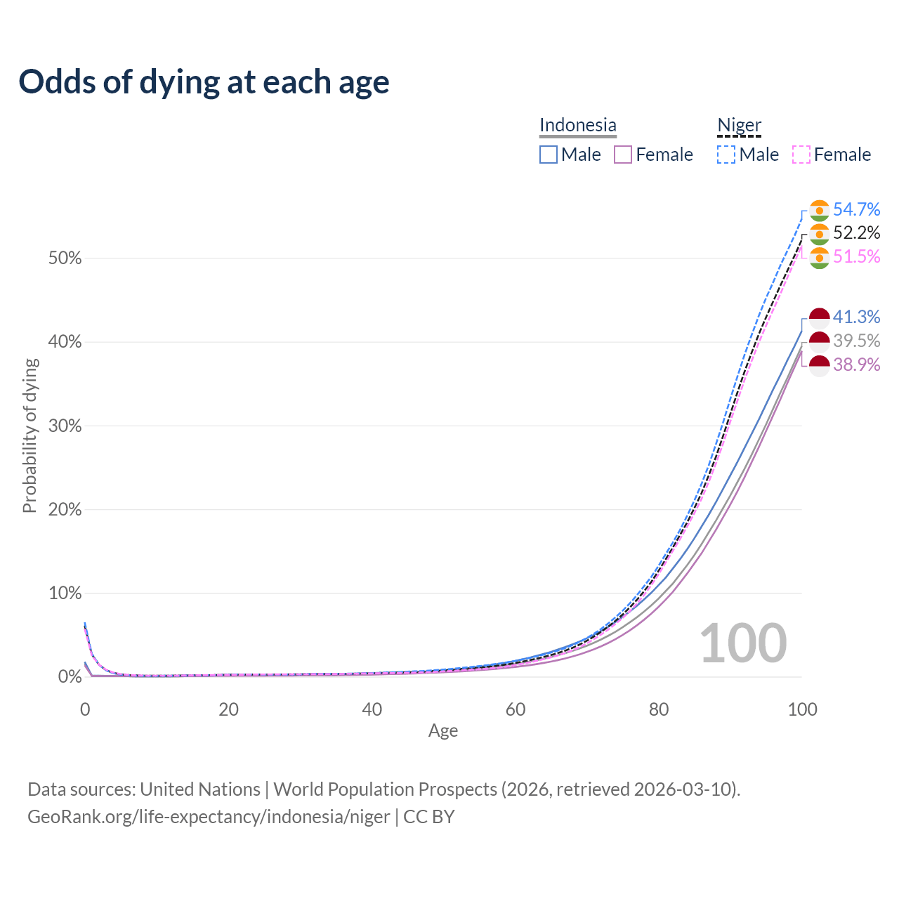 This life expectancy calculator shows the odds of living to 100, 95, 90, and below based on current age for both males and females in Indonesia and Niger, along with mean and median age of death. The calculations are based on the 2026 life tables (actuarial tables) from the UN World Population Prospects.