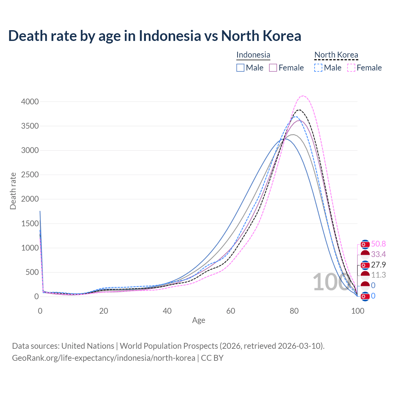 This life expectancy calculator shows the odds of living to 100, 95, 90, and below based on current age for both males and females in Indonesia and North Korea, along with mean and median age of death. The calculations are based on the 2026 life tables (actuarial tables) from the UN World Population Prospects.