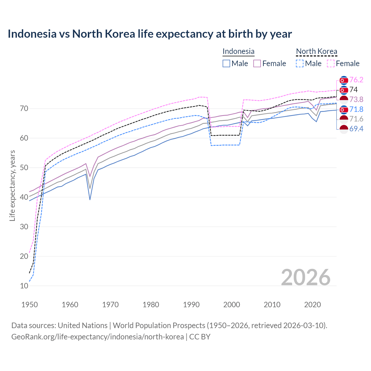 The average life expectancy at birth is 71.6 years in Indonesia vs 74 in North Korea. Indonesia is ranked 130/197 by life expectancy, and North Korea is 104/197. In Indonesia, the life expectancy is 69.4 years for males and 73.8 years for females. In North Korea, it's 71.8 years for males and 76.2 years for females.