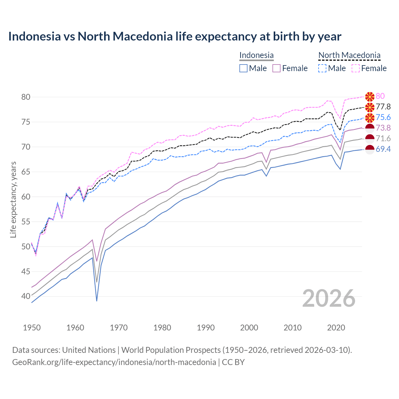 The average life expectancy at birth is 71.6 years in Indonesia vs 77.8 in North Macedonia. Indonesia is ranked 130/197 by life expectancy, and North Macedonia is 67/197. In Indonesia, the life expectancy is 69.4 years for males and 73.8 years for females. In North Macedonia, it's 75.6 years for males and 80 years for females.