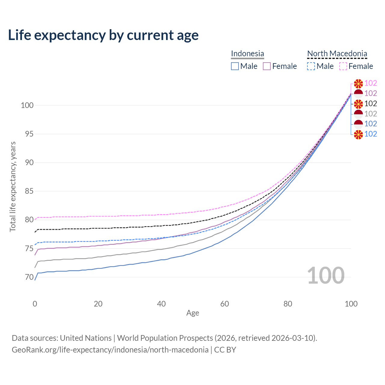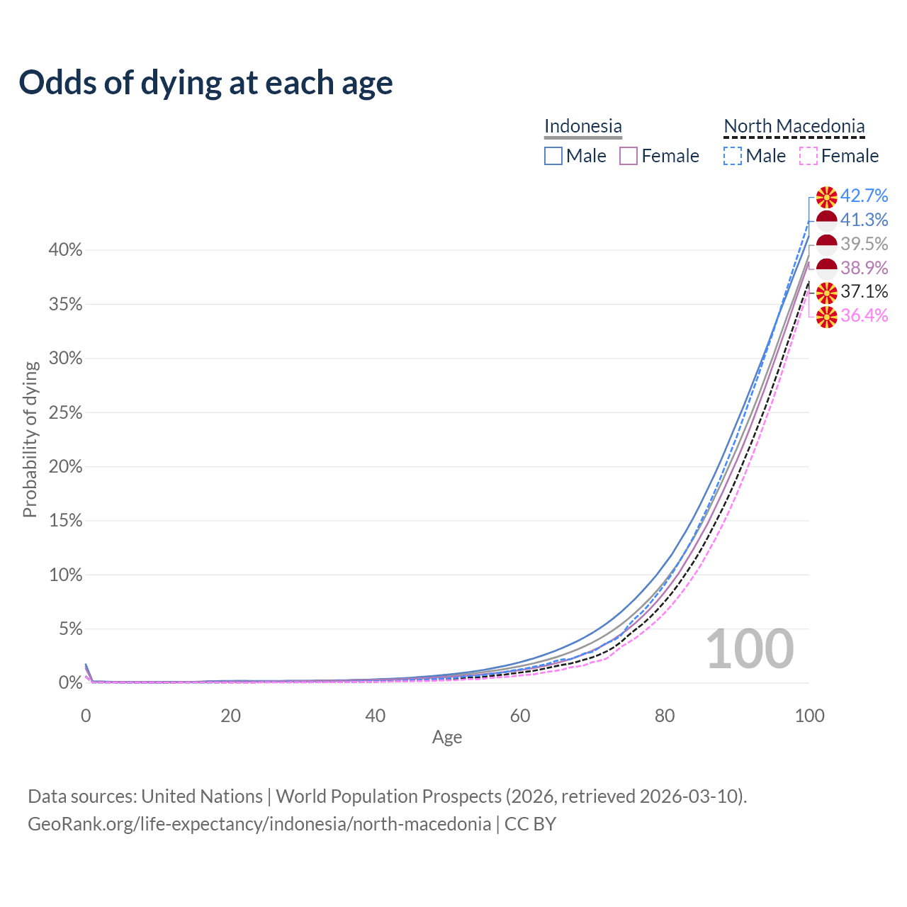 This life expectancy calculator shows the odds of living to 100, 95, 90, and below based on current age for both males and females in Indonesia and North Macedonia, along with mean and median age of death. The calculations are based on the 2026 life tables (actuarial tables) from the UN World Population Prospects.