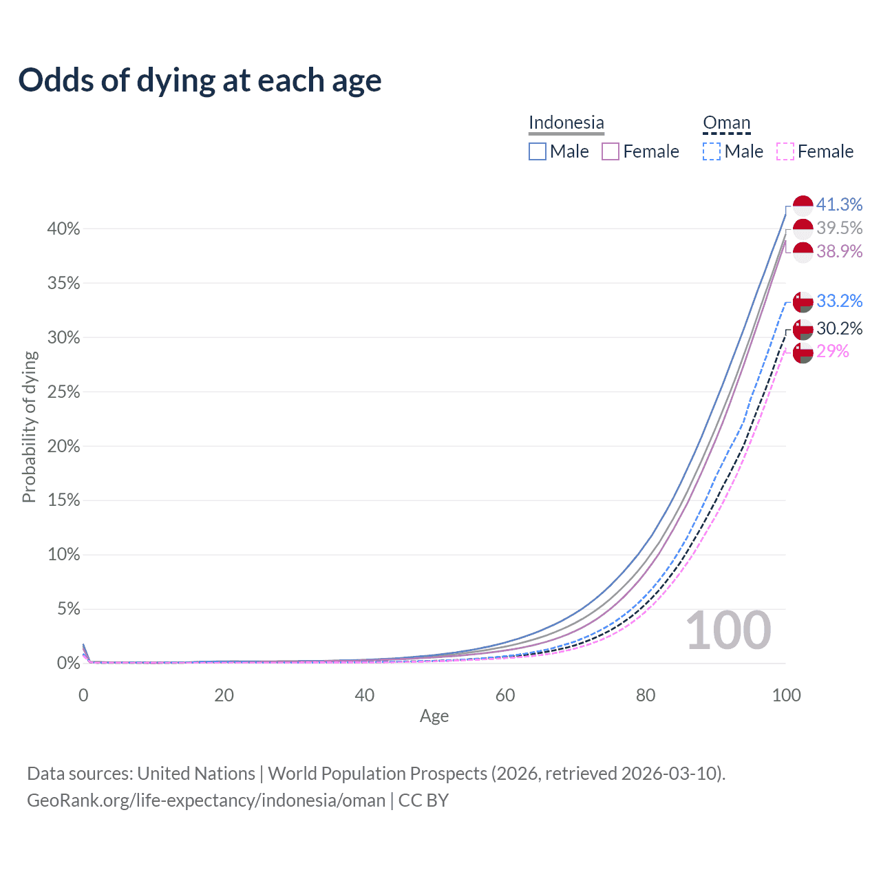 This life expectancy calculator shows the odds of living to 100, 95, 90, and below based on current age for both males and females in Indonesia and Oman, along with mean and median age of death. The calculations are based on the 2026 life tables (actuarial tables) from the UN World Population Prospects.