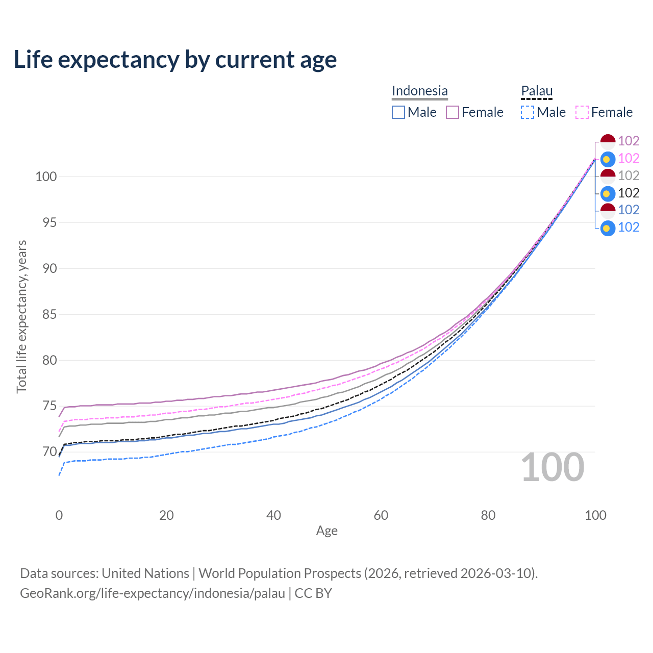 This life expectancy calculator shows the odds of living to 100, 95, 90, and below based on current age for both males and females in Indonesia and Palau, along with mean and median age of death. The calculations are based on the 2026 life tables (actuarial tables) from the UN World Population Prospects.